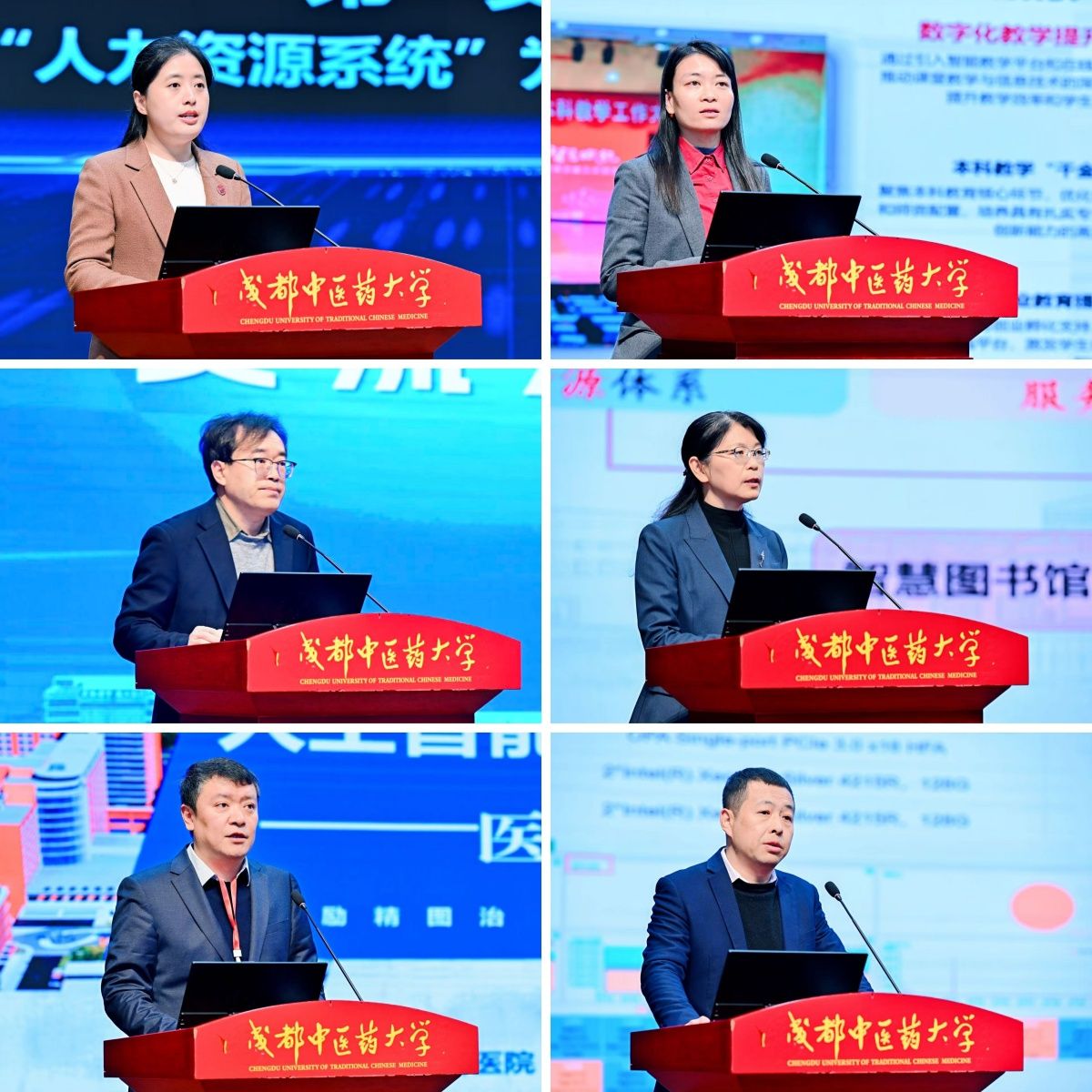 人事处处长戴鸥报告了我校人力资源“云平台”的探索与实践历程,介绍了即将上线的数字客服计划,并发布“优师智评教师教学胜任力评价智能体”。教务处处长胡一梅全面梳理学校在数字化教育教学改革的历史历程,展望教育教学数字化改革3.0计划,推动智慧场景在教育教学方面的落地见效。资产与实验室管理处处长卞金辉围绕虚拟仿真实验数智化实验教学平台建设、资源供给和管理创新等方面汇报了学校实验平台数字化建设的工作成效。图书馆馆长赵琼介绍学校通过图书流通、数据贮存、特色资源数据库、一站式资源获取、学术成果全链条查检、数字档案馆等渠道搭建智慧共生服务体系的基本做法。成都市中西医结合医院副院长黄路非报告医院人工智能数字医疗新样态建设的思路措施、建设成效和未来展望。中医药创新研究院陈伟介绍“成都中医药大学生物信息学高性能计算平台”为校内外各级各类科研项目提供数据支撑和算力支持,在多个科研团队的网站构建与部署,数据与知识驱动的中医药人工智能研究方面取得的显著成效。