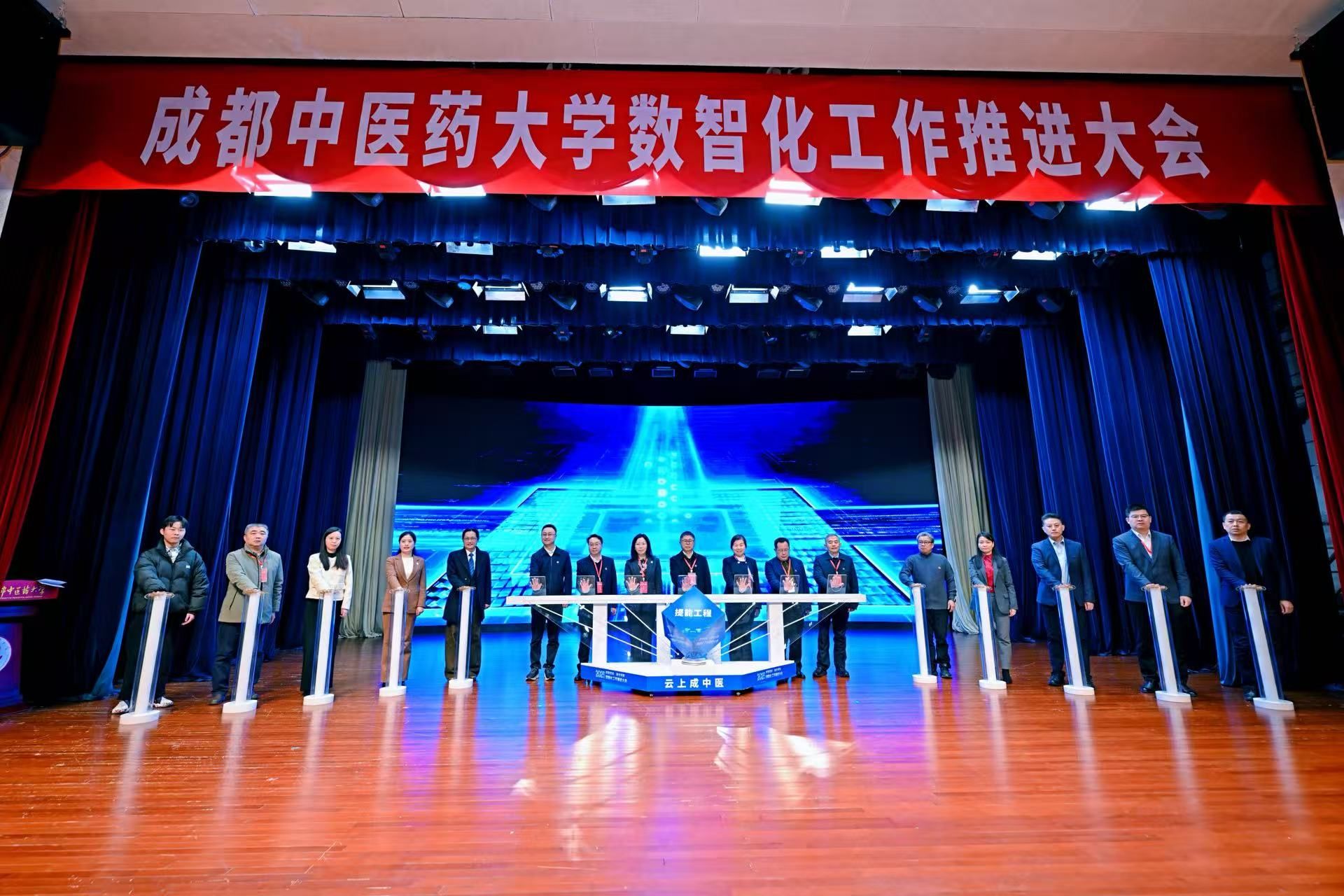 大会发布“四大数智化工程”项目,与会校领导,胡治平,谢嘉权及党政办公室、教务处、人事处、科技处、信息与教育技术中心、附属医院/临床医学院、中医药创新研究院/交叉学科研究院等相关部门代表以及师生代表共同上台触发启动键,点亮未来、共同迈入数智赋能、融合创新发展新征程!