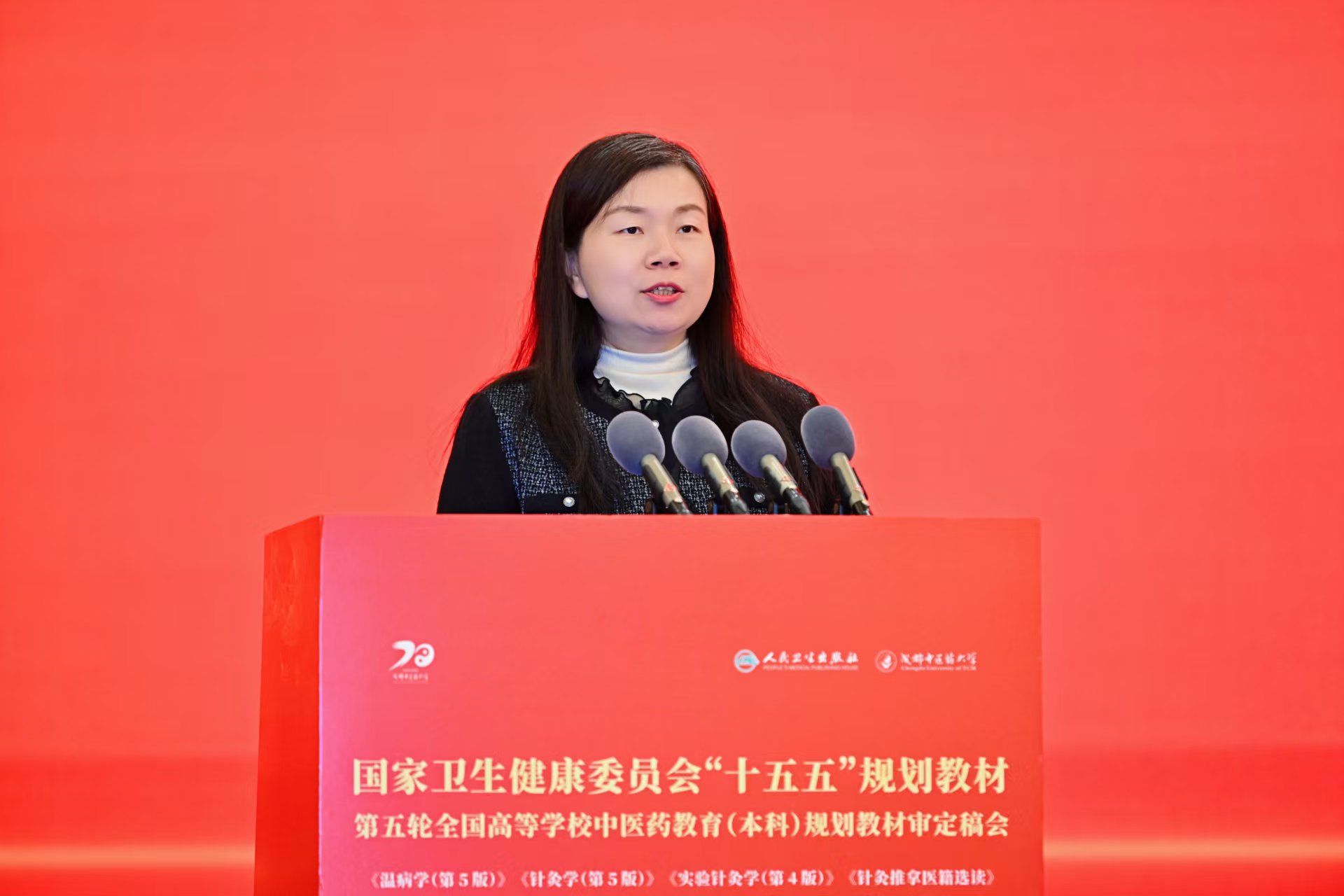 曾芳在致辞中强调,教材是落实“为党育人、为国育才”使命的核心依托,中医药教材更是传承千年岐黄之术、服务健康中国战略实施的重要支撑。作为新中国首批建立的中医药院校、国家“双一流” 建设高校,我校始终将教材建设作为立德树人的关键抓手,深耕不辍推进教材体系优化与质量提升。此次承办审定稿会,学校将携手各界专家学者,深入探讨教材建设新理念、新路径,凝聚行业智慧、共促资源整合,为中医药教育高质量发展注入强劲动力。
