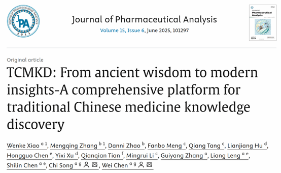 近日,我校中医药创新研究院/交叉学科研究院本草基因组学研究团队在《Journal of Pharmaceutical Analysis》(中科院一区,Top期刊)发表了题为“TCMKD: From Ancient Wisdom to Modern Insights-A Comprehensive Platform for Traditional Chinese Medicine Knowledge Discovery”的文章(图1 文章首页)。TCMKD平台通过整合方剂、疾病、靶标等七类核心数据,构建了涵盖143,331个实体的高质量中医药知识图谱,实现了“证候-方剂-药材-成分-靶标-疾病”之间的全链路关联。平台集成了知识图谱可视化查询工具与智能中医药问答系统,提升了复杂中医药数据的检索与分析效率。此外,TCMKD还提供了文本标注、数据挖掘等一系列智能处理工具,支持“靶标筛选-网络构建-通路富集”一站式分析流程,为揭示中医药作用机制、发现潜在药物靶标等研究提供了技术支撑与解决方案。成都中医药大学本草基因组学团队博士研究生萧文科和张梦晴为共同第一作者,宋驰研究员和陈伟教授为共同通讯作者。