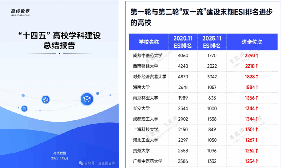 日前,知名高校数据监测和发展服务单位“高绩数据”发布《“十四五”期间“双一流”建设成效分析报告》。报告显示,截至2025年11月,在第二轮“双一流”建设周期内,多所“双一流”高校的全球ESI排名进步飞速,19所高校进步位次过千名,其中,成都中医药大学进步2290名,问鼎全国“双一流”高校ESI全球大学排名上升位次第一。