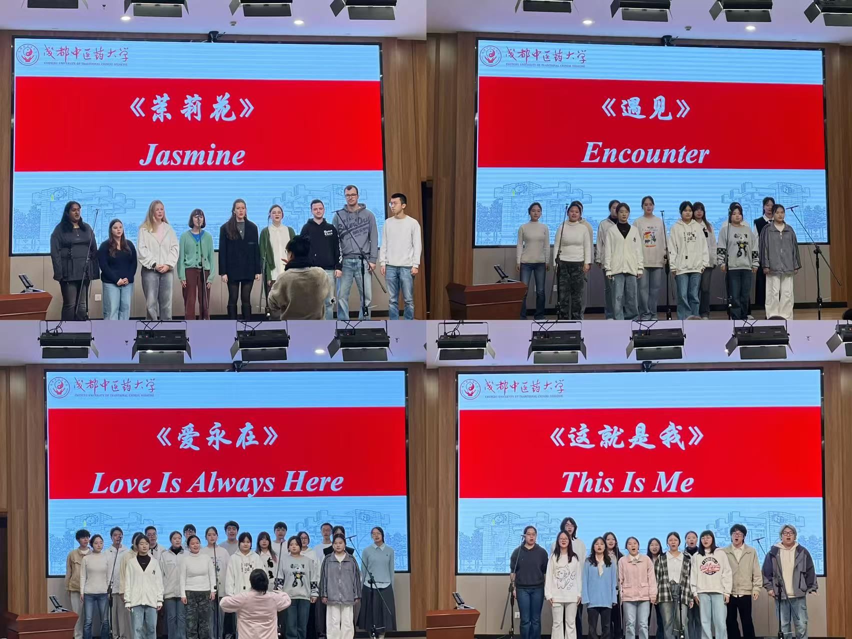 在中德师生交流环节,我校艺术团合唱队与德国伯乐中文合唱团以歌会友,唱响友谊。德国伯乐中文合唱团用字正腔圆的中文演唱了脍炙人口的中国民歌《茉莉花》,其精准的汉语发音和深情的演绎赢得满堂喝彩。随后,我校艺术团合唱队演唱了《遇见》《爱永在》《This is me》三首经典曲目,现场气氛随着旋律层层升温,掌声如潮。