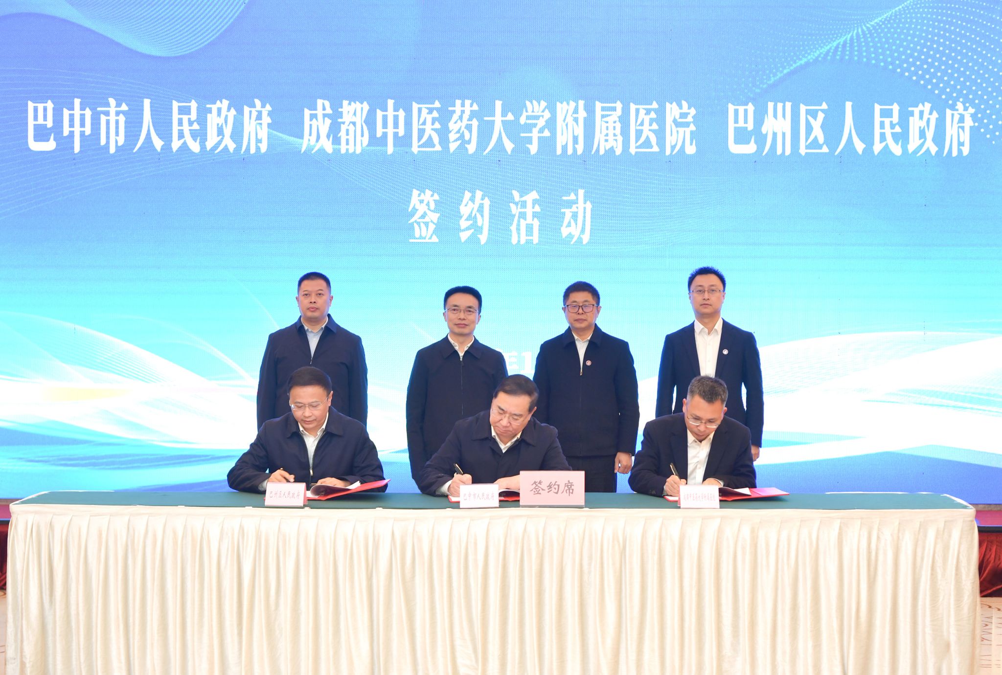 在张泽钧、鲜荣生、郑川、徐勇的见证下,签署了《巴中市中医医院(巴州区人民医院)委托管理协议》。
