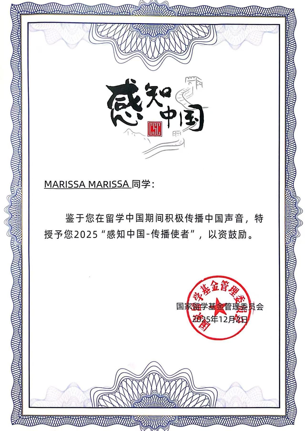近日,国家留学基金管理委员会公布2025年度来华留学生“感知中国”年度人物评选结果,来自我校针灸推拿学院的印度尼西亚籍硕士研究生洪婉晴(MARISSA)凭借其在中医药文化传播、跨文化交流与实践中的积极影响,成功入选。
