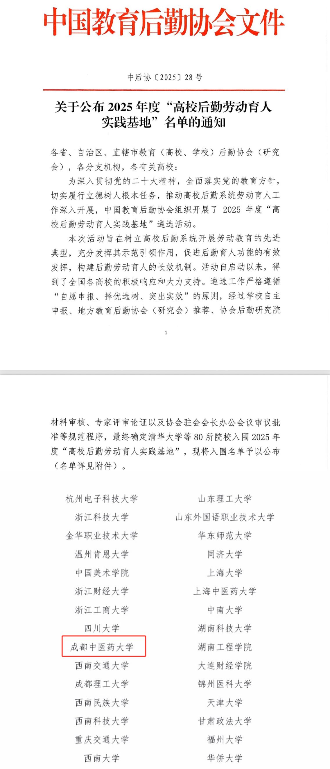 近日,中国教育后勤协会公布了2025年度“高校后勤劳动育人实践基地”名单,我校凭借创新构建的“五维劳育”体系成功入选。