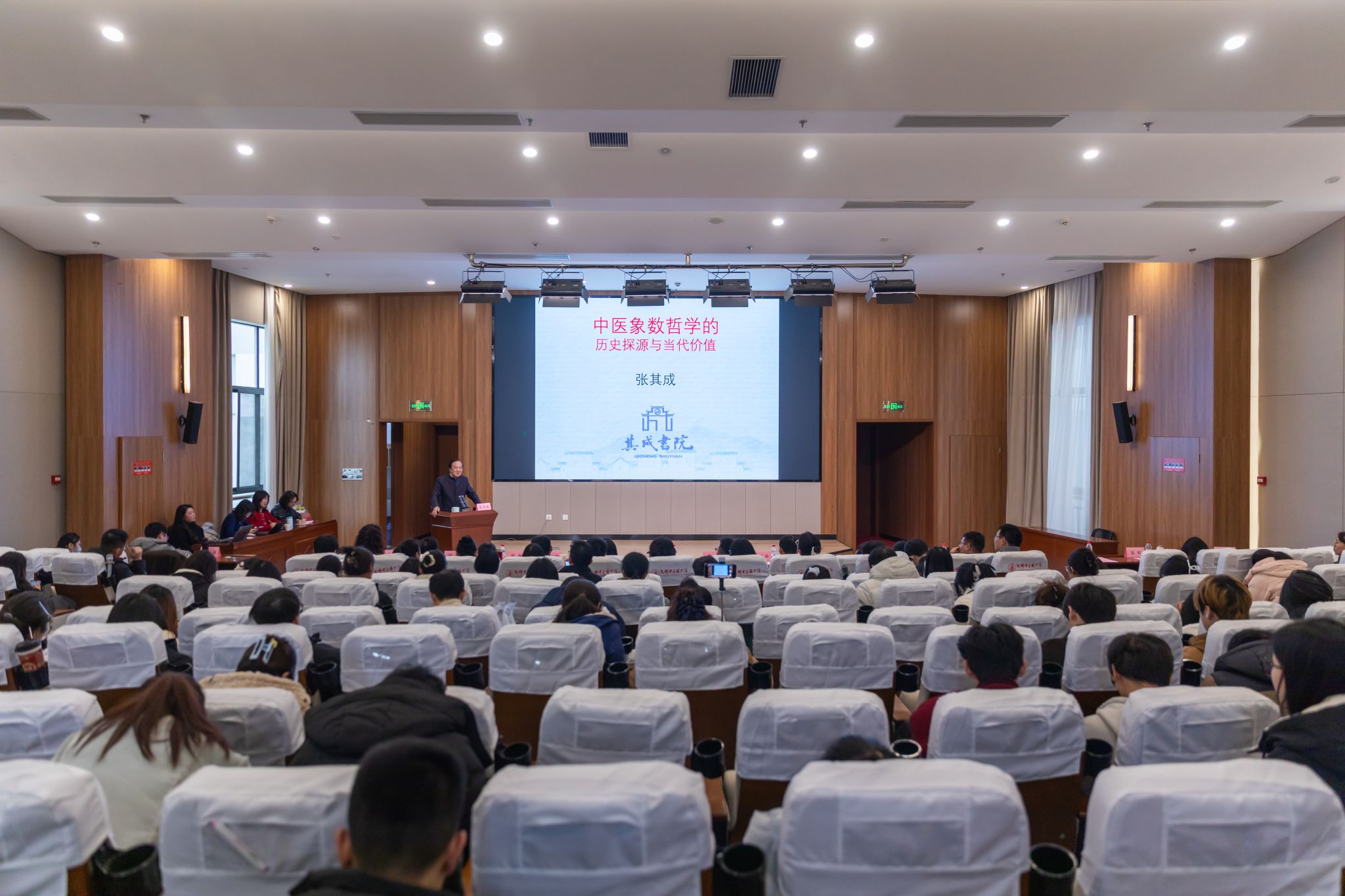 张其成教授作题为《中医象数哲学的历史探源与当代价值》的学术报告。报告从中国哲学特有的“观”之道切入,深刻诠释中医哲学研究中心“医哲会观”的哲学意涵。报告中,张其成教授深入阐释了“医易同原”的核心思想,指出《周易》作为《易经》与《易传》的总和,是中医药文明的哲学基因与思想基石,共同构建了中医“气—阴阳—五行”的核心模型,并强调“易”的变化本质与中医动态平衡哲学的一脉相承。重点解析了中医“象数思维”,通过“象”(形象、符号)和“数”(数字、数理)来认知世界、推演规律、构建知识体系的思维模式。该思维贯穿于藏象、脉象、舌象、证象与药象之中,具有提供关联认知模式、中和方法论以及启迪现代科学的哲学价值。最后,他阐述了中医象数哲学的当代双重价值:一是凝练“阴阳中和”这一中华文明的精神标识,并以考证所得的“太极图”生动图示其内涵;二是推动全民心身健康,倡导将平衡智慧转化为“食饮有节,起居有常”的生活方式及养生实践。整场讲座融学术脉络、考古实证与哲学思辨于一体,贯通古今,在严谨论述中透射出深厚的文化自信与人文关怀,生动展现了中医哲学作为中华文明“活态”精神标识的博大与精深。