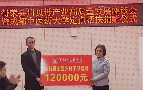 座谈会上举行了定点帮扶捐赠仪式,学校支持得荣县乡村干部培训12万元,支持得荣县奔都乡发展庭院经济12.4万元。