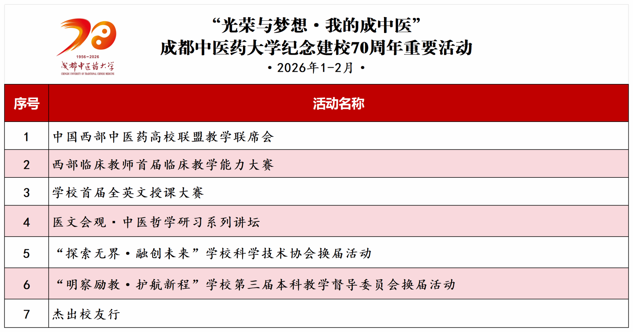 【校庆专题】纪念建校70周年重要活动(1-2月) 发布时间:2026-01-04 11:08:36 浏览次数: 次 【字体:小 大】 【打印正文】 上一条:在服务乡村全面振兴中践行成中医使命 下一条:围绕医院向医学院转型核心目标 加快推进四川省康复医学院建设