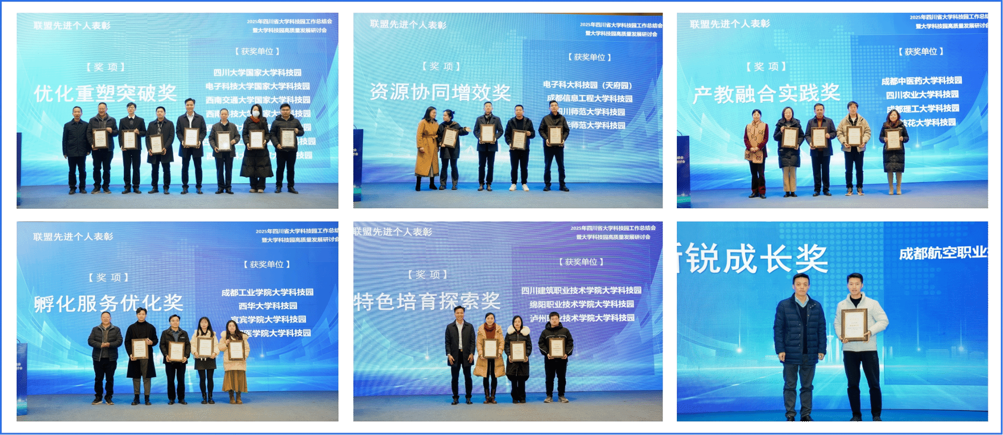 随后,大会举行了2025年度表彰仪式。对在体制机制改革、资源整合、产教融合、企业孵化及特色化发展等方面表现突出的先进集体与个人予以表彰。我校大学科技园获联盟2025年度“产教融合实践奖”。