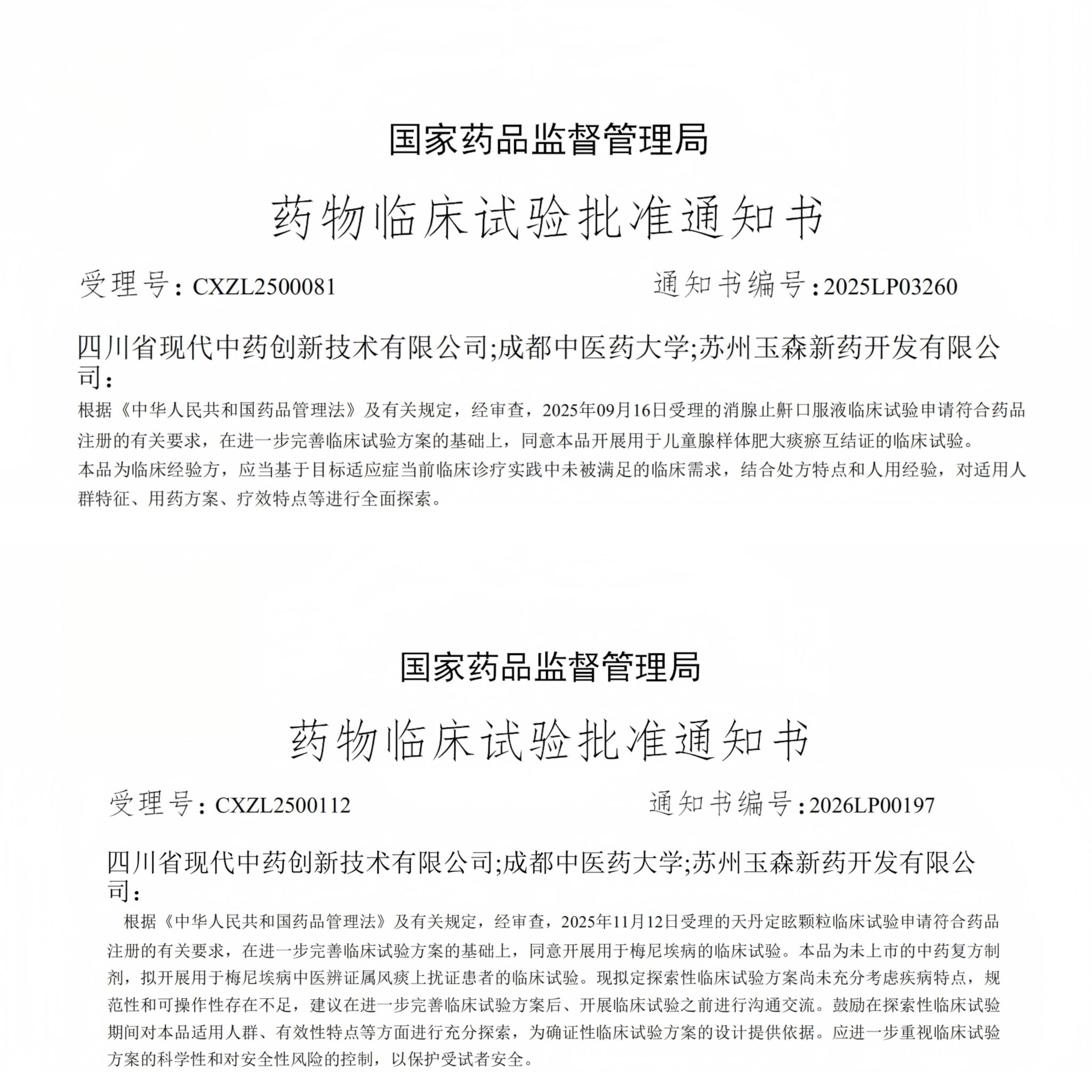 近日,由我校联合四川省现代中药创新技术有限公司、苏州玉森新药开发有限公司共同申报的两个1.1类中药创新药——“消腺止鼾口服液”和“天丹定眩颗粒”,正式获得国家药品监督管理局颁发的药物临床试验批准通知书,标志着两款新药的研发迈入临床研究新阶段。