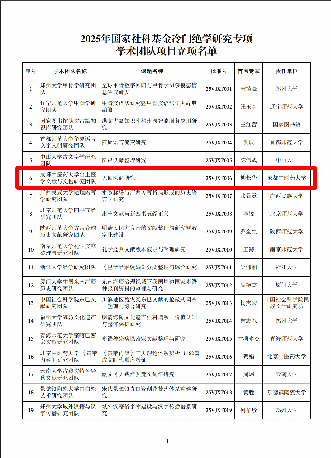 1月26日,全国哲学社会科学工作办公室公布2025年国家社科基金冷门绝学研究专项项目立项名单,我校柳长华教授牵头申报的“天回医简研究”获批学术团队项目,实现我校在冷门绝学研究专项上的又一重要突破。