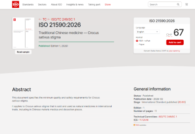 近日,《中医药-西红花》(ISO 21590: 2026 Traditional Chinese medicine—Crocus sativus stigma)国际标准正式发布。该标准制定由我校药学院裴瑾教授牵头,好医生药业集团有限公司、四川省中药饮片有限责任公司共同参与,于2022年提案,2023年获ISO正式立项。该标准的出台,标志着西红花这一传统名贵中药材质量标准获得国际认可,为传统名贵中药材西红花建立了全球统一、权威规范的质量技术体系,标志着中医药国际标准再获重要突破。