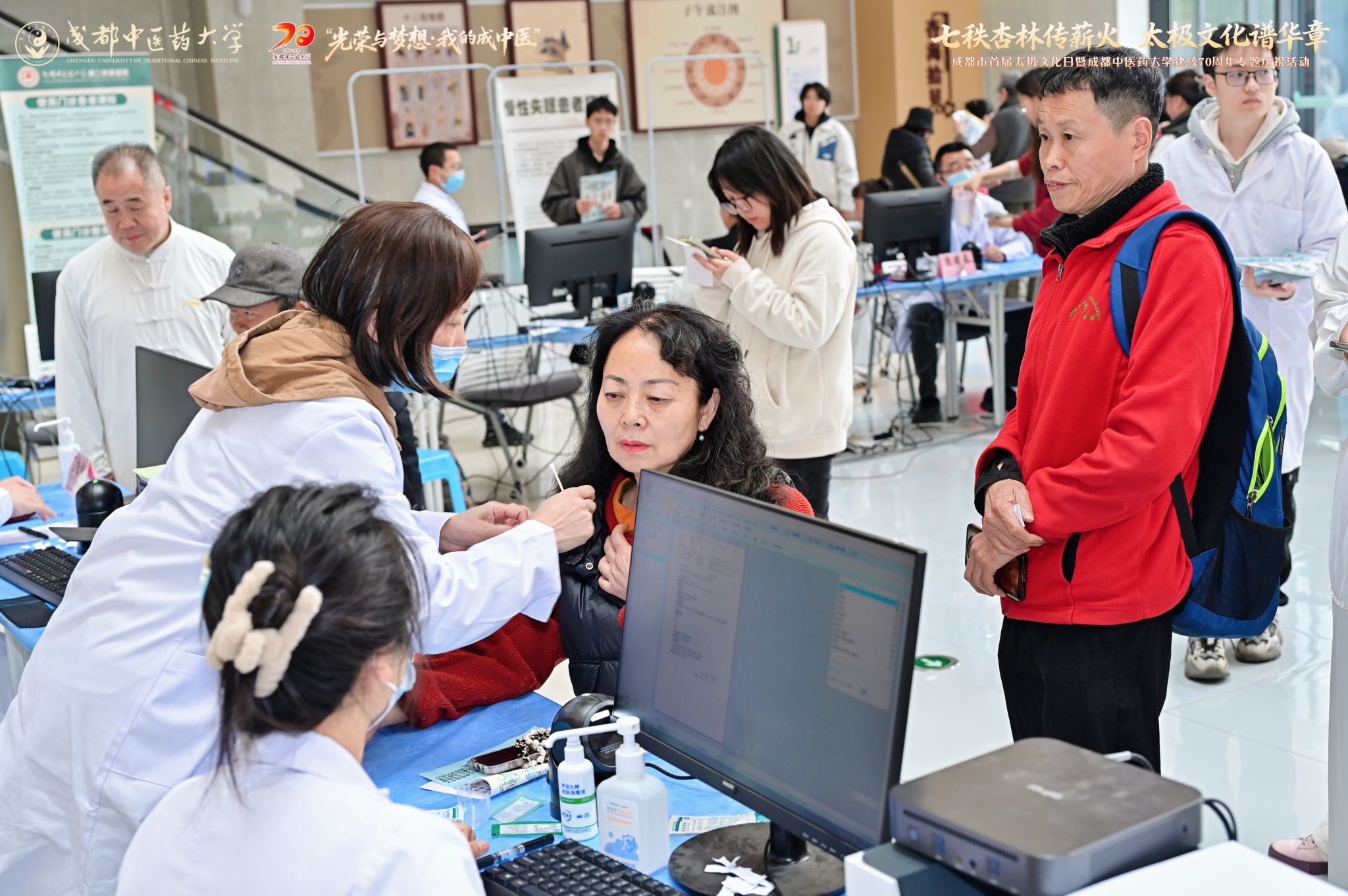 此次“太极文化日”活动还举办中医药文化体验与惠民义诊活动,邀请广大市民、回家校友共同感悟成都中医药大学建校70周年发展成就。在成都中医药大学博物馆和校史馆内,陈列的珍贵药材标本、中医药发展史料文物和早期建校历程展品吸引着众多市民驻足。成都中医药大学第二附属医院举办的义诊活动上,“最近想不想吃?”“睡眠怎样?”“请将舌头伸出来我看看”,朴实话语间满是医者关怀。现场还专设针灸、推拿体验服务,医护人员精心送上春分时节养生贴士。特色草药香囊伴着淡雅香气和吉祥寓意,成为市民师生手中一份建校70周年“来自成中医的礼物”。