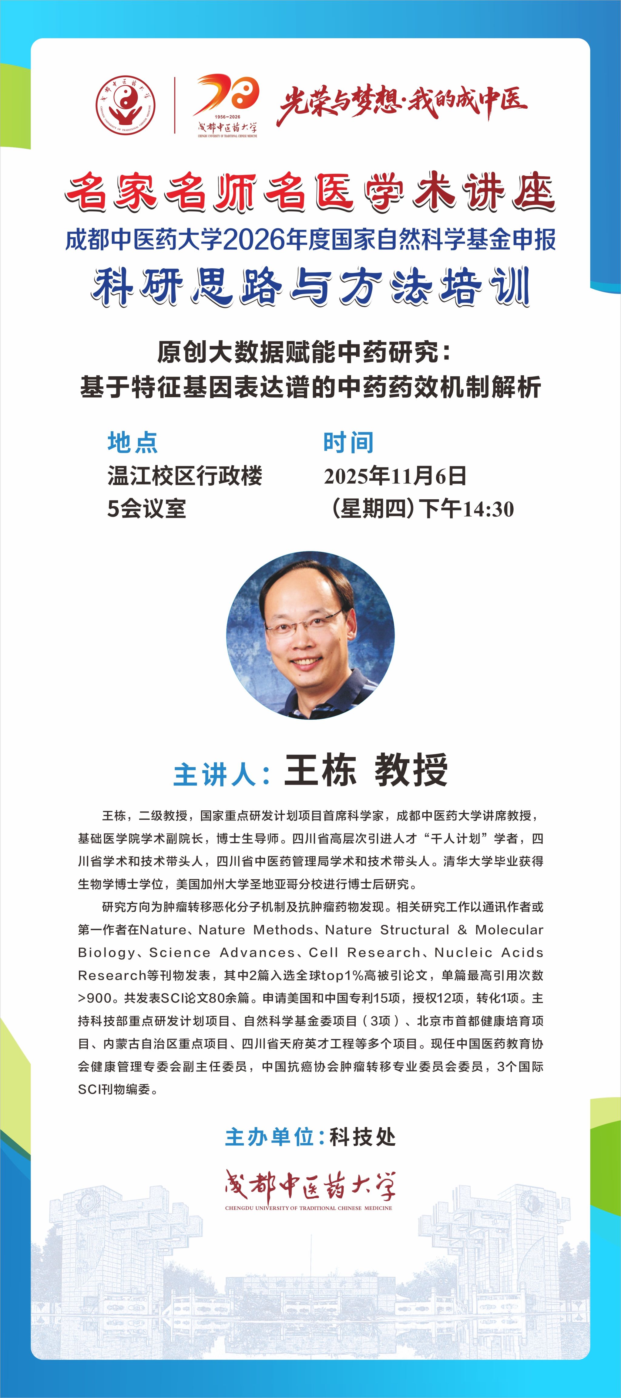 会议预告丨名家名师名医学术讲座 成都中医药大学2026年度国家自然科学基金申报科研思路与方法培训 发布时间:2025-11-05 09:26:38 浏览次数: 次 【字体:小 大】 题 目 1:原创大数据赋能中药研究:基于特征基因表达谱的中药药效机制解析时 间:2025年11月6日(星期四) 下午14:30主讲人:王 栋 成都中医药大学题 目 2:生物3D打印技术进展时 间:2025年11月6日(星期四) 下午15:30主讲人:苟马玲 四川大学地 点:温江校区行政楼5会议室主 办:科技处 【打印正文】 上一条:会议预告丨柳台临床中药大讲堂第三期 下一条:会议预告丨生物医药系列学术讲座 国家自然科学基金申报专题