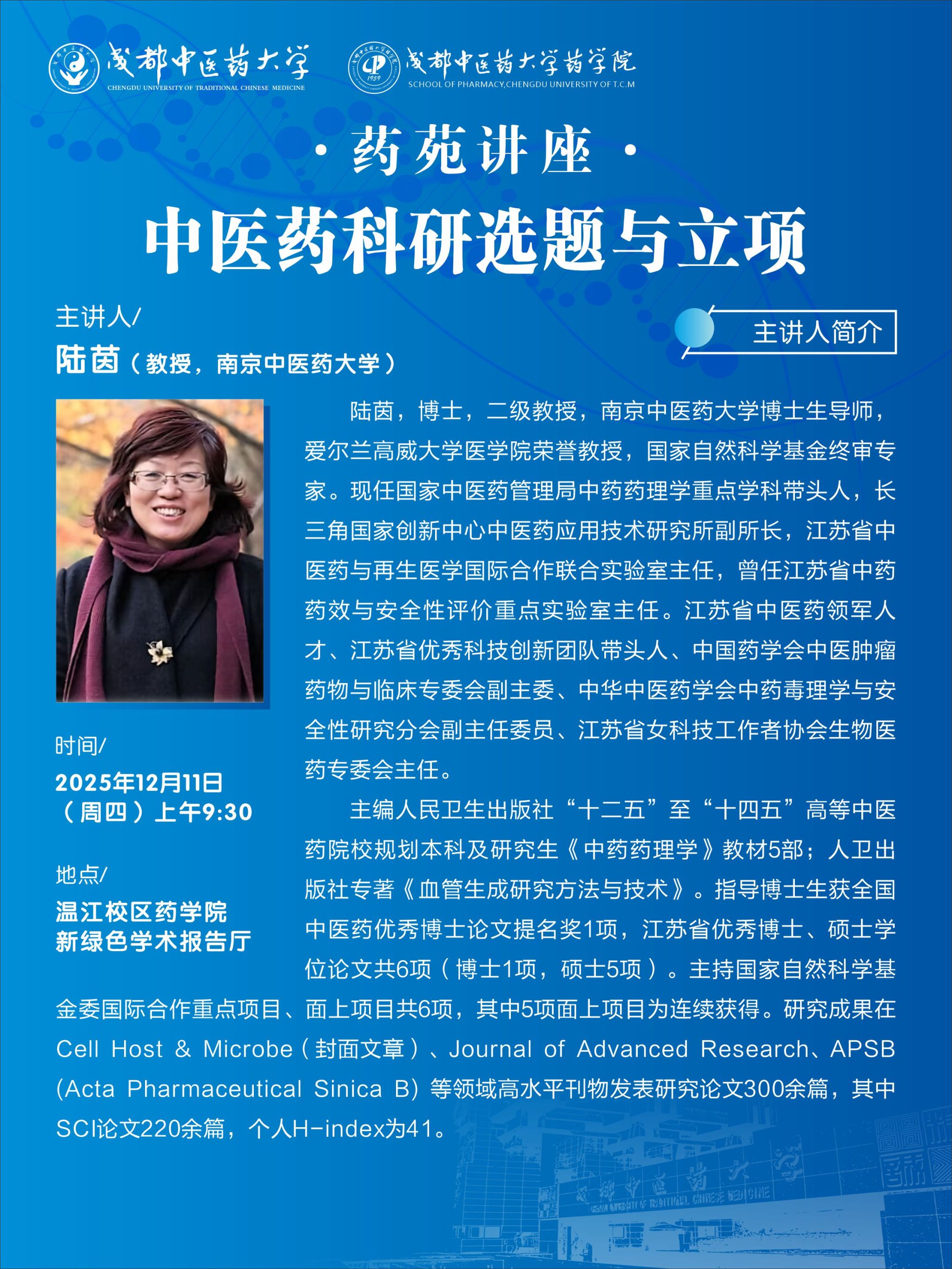 会议预告丨药苑讲座 发布时间:2025-12-08 15:25:58 浏览次数: 次 【字体:小 大】 题 目:中医药科研选题与立项时 间:2025年12月11日(星期四) 上午9:30地 点:温江校区药学院新绿色学术报告厅主讲人:陆 茵 南京中医药大学主 办:成都中医药大学 成都中医药大学药学院 【打印正文】 上一条:会议预告丨药苑讲座 下一条:会议预告丨名家名师名医学术讲座:国家自然科学基金(管理学部)项目申报的心得体会
