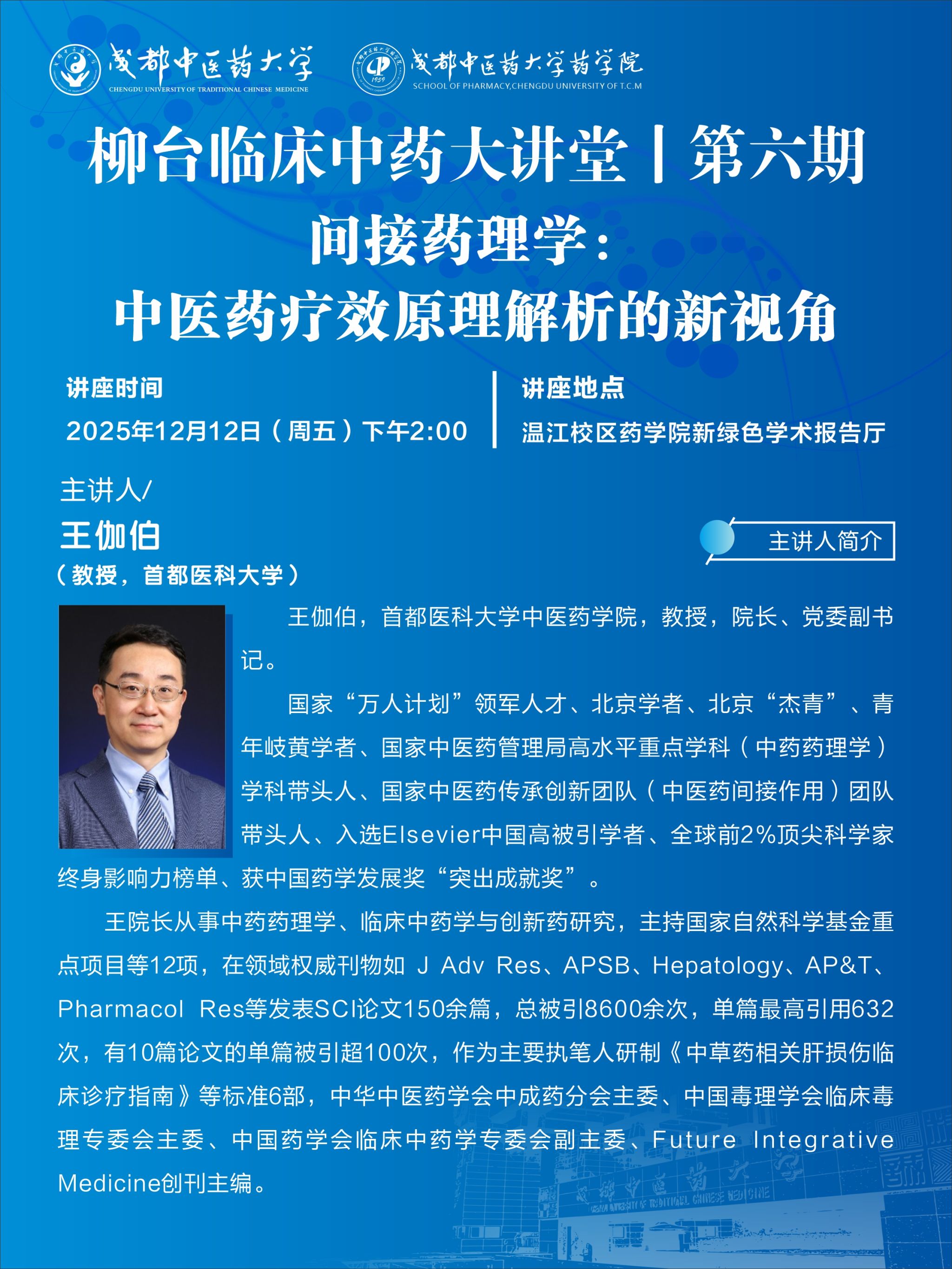 会议预告丨柳台临床中药大讲堂第六期 发布时间:2025-12-12 10:25:48 浏览次数: 次 【字体:小 大】 题 目:间接药理学:中医药疗效原理解析的新视角时 间:2025年12月12日(星期五) 下午14:00地 点:温江校区药学院新绿色学术报告厅主讲人:王伽伯 首都医科大学主 办:成都中医药大学 成都中医药大学药学院 【打印正文】 上一条:学术成果丨我校学者在川芎水稻轮作内在机制解析系列研究中取得新进展 下一条:会议预告丨药苑讲座