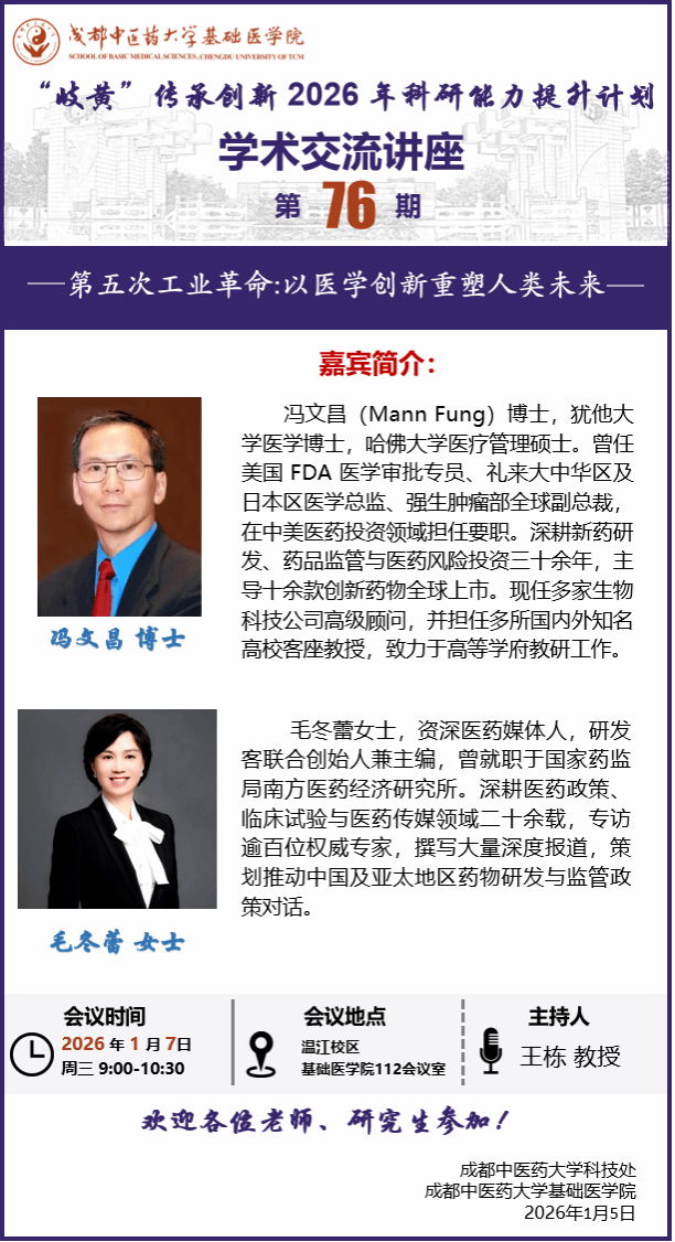 会议预告丨“岐黄”传承创新2026年科研能力提升计划学术交流讲座第76期 发布时间:2026-01-05 11:12:13 浏览次数: 次 【字体:小 大】 题 目:第五次工业革命:以医学创新重塑人类未来时 间:2026年1月7日 (星期三) 9:00地 点:温江校区基础医学院112会议室主讲人:冯文昌 美国 Macafex 咨询公司 毛冬蕾 上海汐潮信息技术有限公司主 办:科技处 基础医学院 【打印正文】 上一条:会议预告丨“致知·融智”生物医药系列学术讲座 国家自然科学基金申报专题第八期 下一条:学术成果丨我校学者在川芎水稻轮作内在机制解析系列研究中取得新进展
