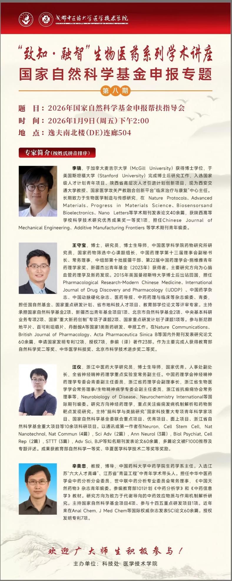 会议预告丨“致知·融智”生物医药系列学术讲座 国家自然科学基金申报专题第八期 发布时间:2026-01-05 17:12:41 浏览次数: 次 【字体:小 大】 题 目:2026年国家自然科学基金申报帮扶指导会时 间:2026年1月9日 (星期五) 下午14:00地 点:温江校区逸夫南北楼(DE)连廊504主讲人:李 骁 西安交通大学 王守宝 中国医学科学院药物研究所 汪 仪 浙江中医药大学 辛贵忠 中国药科大学主 办:科技处 医学技术学院 【打印正文】 上一条:学术成果丨我校学者在《Drug Resistance Updates》发表光热微凝胶递药体系促进耐药菌感染伤口愈合的研究成果 下一条:会议预告丨“岐黄”传承创新2026年科研能力提升计划学术交流讲座第76期