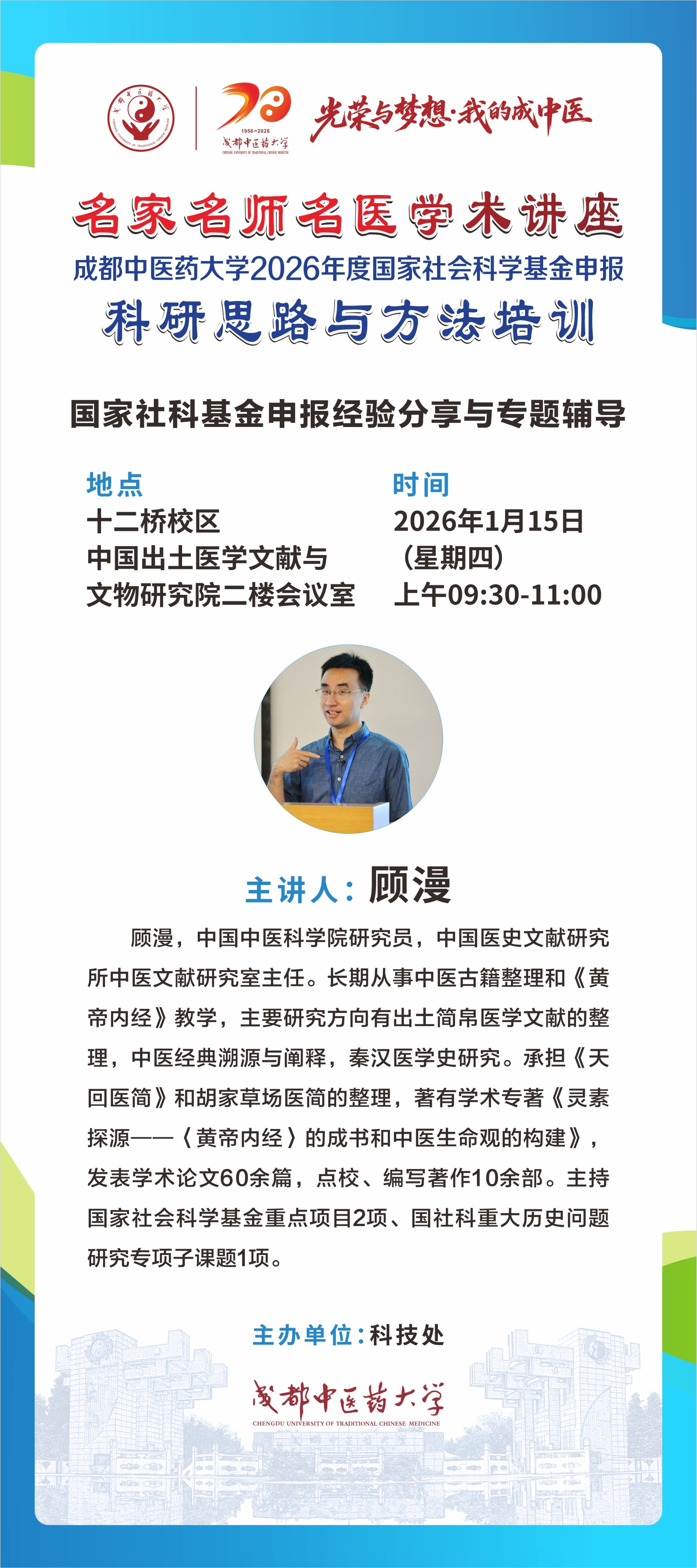 会议预告丨名家名师名医学术讲座 成都中医药大学2026年度国家社会科学基金申报科研思路与方法培训 发布时间:2026-01-14 08:55:40 浏览次数: 次 【字体:小 大】 题 目:国家社科基金申报经验分享与专题辅导时 间:2026年1月15日(星期四) 上午09:30地 点:十二桥校区中国出土医学文献与文物研究院二楼会议室主讲人:顾漫 中国中医科学院主 办:科技处 【打印正文】 下一条:没有了! 下一条:会议预告丨名家名师名医学术讲座 成都中医药大学2026年度国家自然科学基金申报科研思路与方法培训
