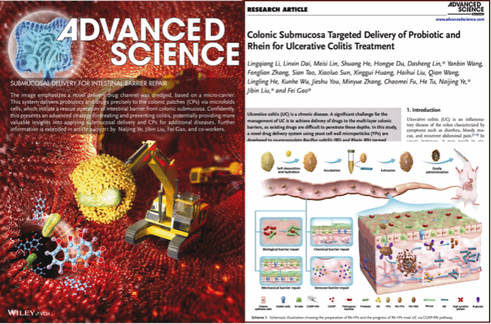 我校现代中药产业学院高飞教授,联合基础医学院刘悸斌副教授、临床医学院叶乃菁副教授在中医药特色靶标挖掘治疗溃疡性结肠炎研究方面取得进展,相关成果以“Colonic Submucosa Targeted Delivery of Probiotic and Rhein for Ulcerative Colitis Treatment”为题,作为卷首文章(Frontispiece)发表在《ADVANCED SCIENCE》(中科院一区,TOP期刊),并被编辑部高亮重点推荐。我校高飞教授、刘悸斌副教授、叶乃菁副教授为共同通讯作者,博士生李龄强为第一作者。