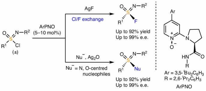 团队发现了一种催化不对称亚砜亚胺基团转移反应策略,利用自主研发的4-芳基吡啶氮氧催化剂ArPNO,以外消旋的氯代亚砜亚胺为反应物,成功实现了催化不对称亚砜亚胺基团转移反应,构建了光学活性的氟代亚砜亚胺及其衍生物。实验与理论计算研究表明,该反应属于动态动力学不对称转化,两分子催化剂结合的五配位硫中间体是实现硫构型原位消旋化的关键。所得光学活性氟代亚砜亚胺可与碳、氮、氧中心的亲核试剂发生立体专一性硫氟交换反应,从而为不对称硫氟交换提供模块化平台。