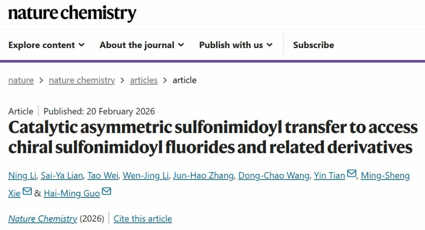 我校药学院田寅特聘研究员课题组,联合河南师范大学化学化工学院郭海明教授和谢明胜教授课题组在点击化学领域取得突破性进展,该研究从新型手性催化剂和反应路径设计入手,首次采用常规稳定试剂在温和条件下成功实现了从外消旋氯代亚砜亚胺到光学活性氟代亚砜亚胺的高效构建,由此为硫氟交换点击化学装上了立体精准导航系统。该成果以 “Catalytic asymmetric sulfonimidoyl transfer to access chiral sulfonimidoyl fluorides and related derivatives” 为题,于2026年2月20日发表于自然学科类大子刊Nature Chemistry(《自然化学》,中科院一区,TOP期刊)。我校田寅特聘研究员和河南师范大学郭海明教授、谢明胜教授为该论文的共同通讯作者。