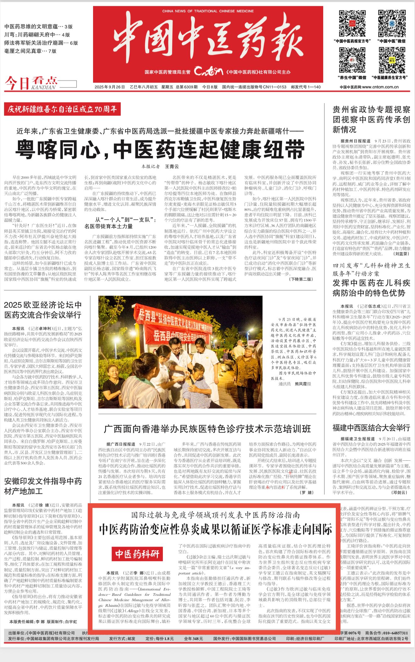【中国中医药报】国际过敏与免疫学领域顶刊发表中医药防治指南 中医药防治变应性鼻炎成果以循证医学标准走向国际 发布时间:2025-10-15 10:33:27 浏览次数: 次 【字体:小 大】 【打印正文】 下一条:没有了! 下一条:【中新网】四川省康复医学院正式成立