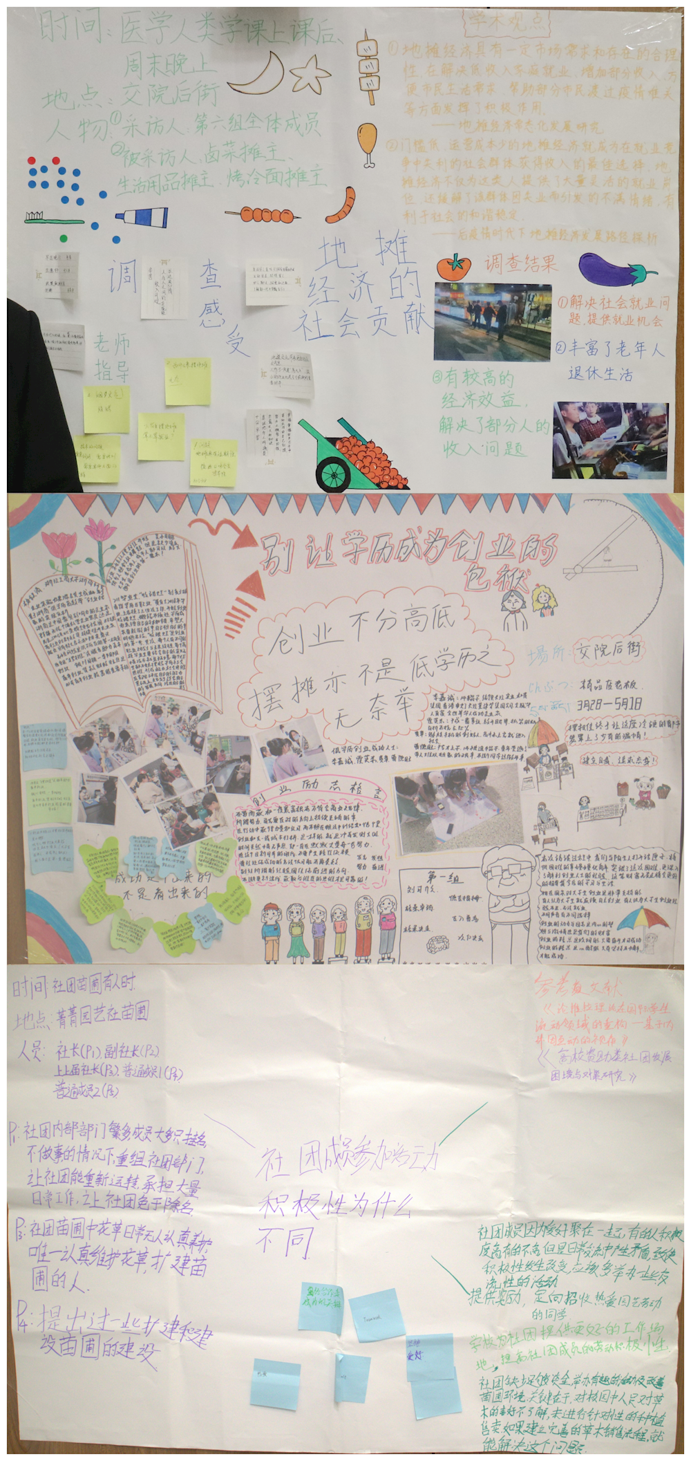 在本门课程教学过程中,同学们从第七周开始以小组为单位开始项目式学习,项目要求同学们化身为人类学家,结合所学知识开展一次田野调查,找到“一类人”(研究对象)进行访谈和参与观察,理解他们的生活,发现他们面临的或者揭示的社会问题,并寻求其社会文化根源和解决办法,为相关政府部门提供建议。在随后的教学过程中,张老师将理论教学内容与项目任务结合起来,一步一步地帮助同学们明确任务要求、推进项目的完成。在课程的最后一次课上,同学们采用海报配合演讲的形式集中展示调研成果。
