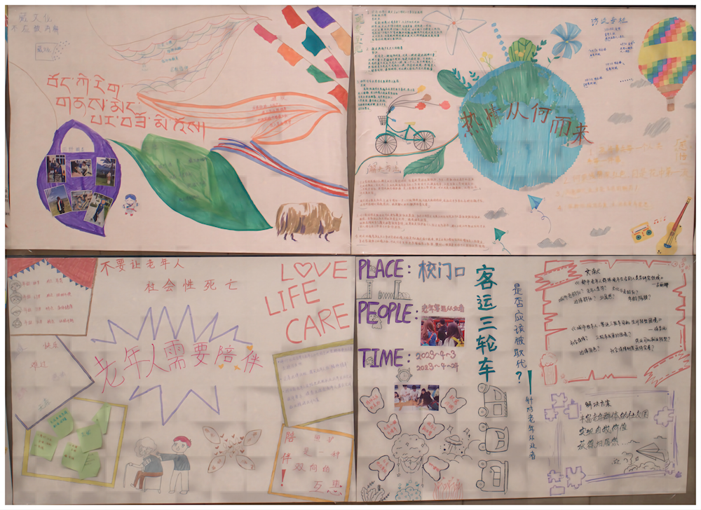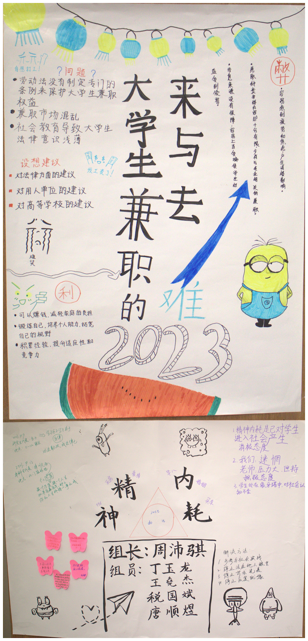 接下来,是同学们项目式学习成果展示。“藏文化会被消解吗?”、“别让学历成为创业的包袱”、“热情从何而来?”、“大学生兼职”、“大学生社团成员积极性的问题”、“老年三轮客运车”、“地摊经济”、“早八与精神内耗”……从大学生身边事,到民生问题,再到民族文化,同学们关注的话题范围广泛,调研角度新颖。8分钟的现场调研汇报,同学们以演讲的形式,对调研的过程、调研结果、社会问题的发现和解决方案等进行展示,主题层层推进,语言慷慨激昂,提问发人深省,引得全场师生的共鸣。海报展示环节,同学们将调研的情况绘制成一幅幅色彩绚丽的海报,主题明确,观点鲜明,创意十足,清晰地表现了调研的成果。