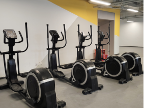 黑白灰的空间里,突然跳出一抹亮黄、一角绿意——是心动的感觉!健身房器材充足,排列宽松不挤碰。整面窗引进自然光+天花板长灯补光,照亮你的每一个努力瞬间 地面防滑又耐磨,怎么动都安心。