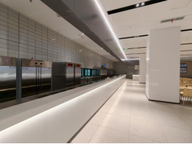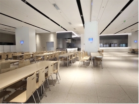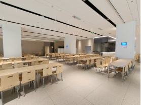 食堂采用纯白+浅木色主打一个治愈系!不锈钢台面、整齐的座椅、瓷砖地面——怎么看怎么清爽。操作区有灯带,就餐区有长条灯,灯光超贴心~ 信息屏、冷藏柜…及时保鲜方便拿取,吃饭更便捷!