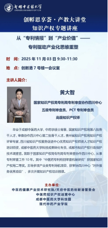 黄大智(国家知识产权局专利局专利审查协作四川中心五级专利审查员、PCT专利审查员高级知识产权师)毕业于成都中医药大学,中药学硕士背景,国家知识产权局第八批骨干人才,审查协作四川中心第二批骨干人才。贵州省知识产权局知识产权评审专家,四川省知识产权服务促进中心优秀知识产权师资人才知识产权培训师资,成都中医药大学科技成果转化专员,成都市知识产权行政保护技术调查官。就职于国家知识产权局专利局专利审查协作四川中心,从事专利审查工作10年。其中“中医药专利特别审查机制研究”获国家知识产权局二等奖。主导多项产业类专利导航项目,获审协四川中心“对外服务优秀项目”,多次开展知识产权培训授课。