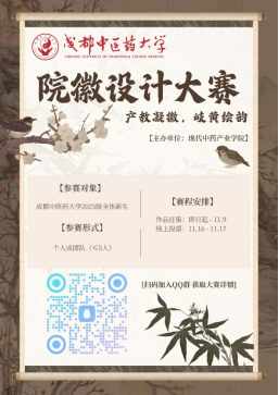 活动相关信息可到现代中药产业学院官网https://www.cdutcm.edu.cn/xdzycyxy/index.htm或官Q“现代中药产业学院”查询,色彩元素可参考其他学院。