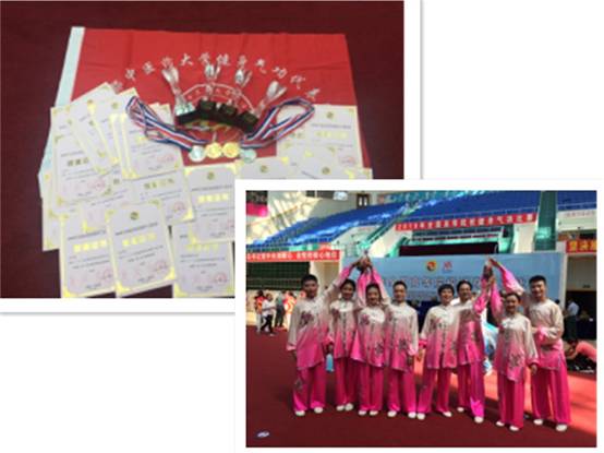 我校派出由校工会常务副主席宋岚和体育学院党委书记丁廷孝为领队、胡剑秋和徐巧为教练、3名教师和5名学生组成的代表团。队员们发扬成中医精神,展示成中医人风采,共获得集体一等奖2个,集体二等奖2个,其中学生队集体竞赛五禽戏连续三年获得冠军;个人项目获得金牌2枚,银牌2枚,1个第四名,其中女子个人竞赛易筋经连续四年获得冠军。同时,我校以9.215的最高分获得健身气功推广成果奖和最佳推广奖,丁廷孝获得优秀领队称号,代华松获体育道德风尚奖。