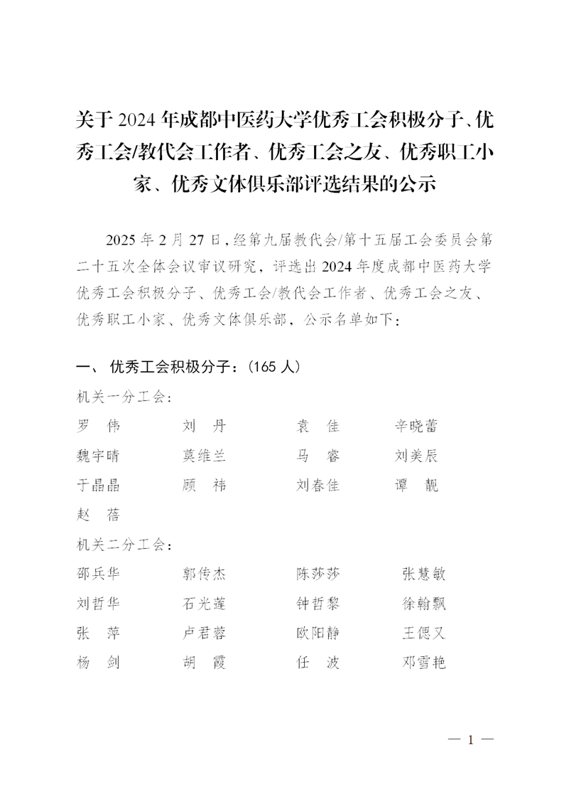 关于2024年成都中医药大学优秀工会积极分子、优秀工会/教代会工作者、优秀工会之友、优秀职工小家、优秀文体俱乐部评选结果的公示