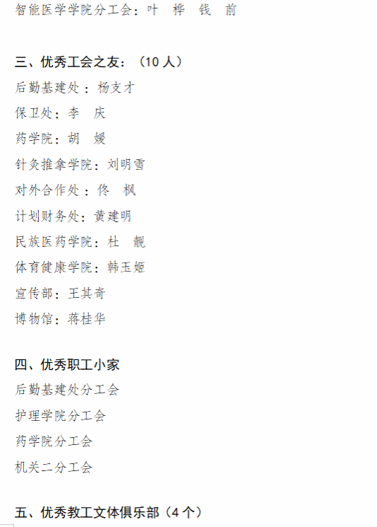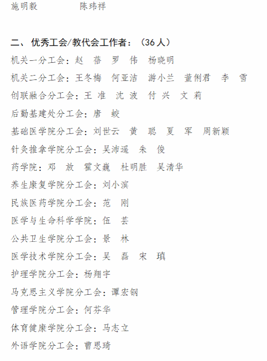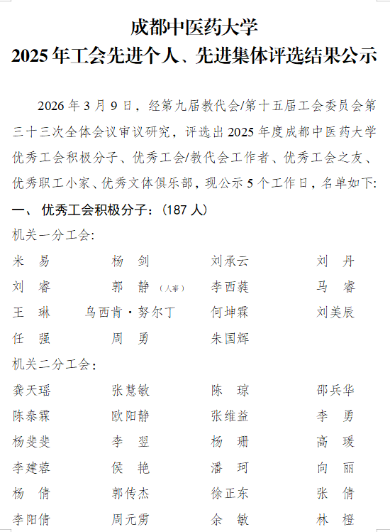 下一条:关于2024年成都中医药大学优秀工会积极分子、优秀工会/教代会工作者、优秀工会之友、优秀职工小家、优秀文体俱乐部评选结果的公示