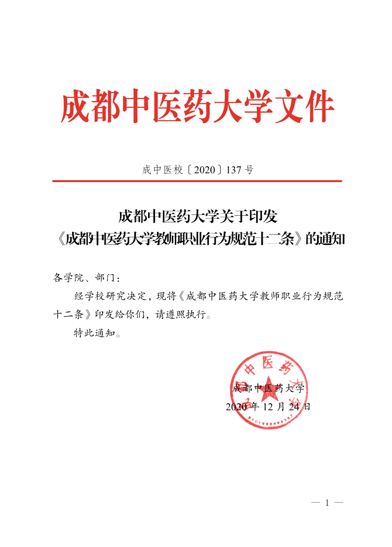 成中医校〔2020〕137号:成都中医药大学关于印发《成都中医药大学教师职业行为规范十二条》的通知