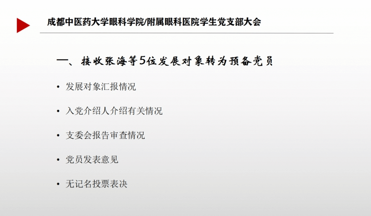经全体正式党员投票表决,一致同意蓝诗翰、郭玉娟、邱珍妮、高蒙恩、徐文萱、马晓琪、童宇婷、杨诗蕊、曾艳、郭礼珊10名预备党员按期转正;一致同意接收张海、李雯婷、刘希玥、黎晓冬、陆淇彦5名同志为中共预备党员并公示7天,经公示无异议将报上级党委审批。