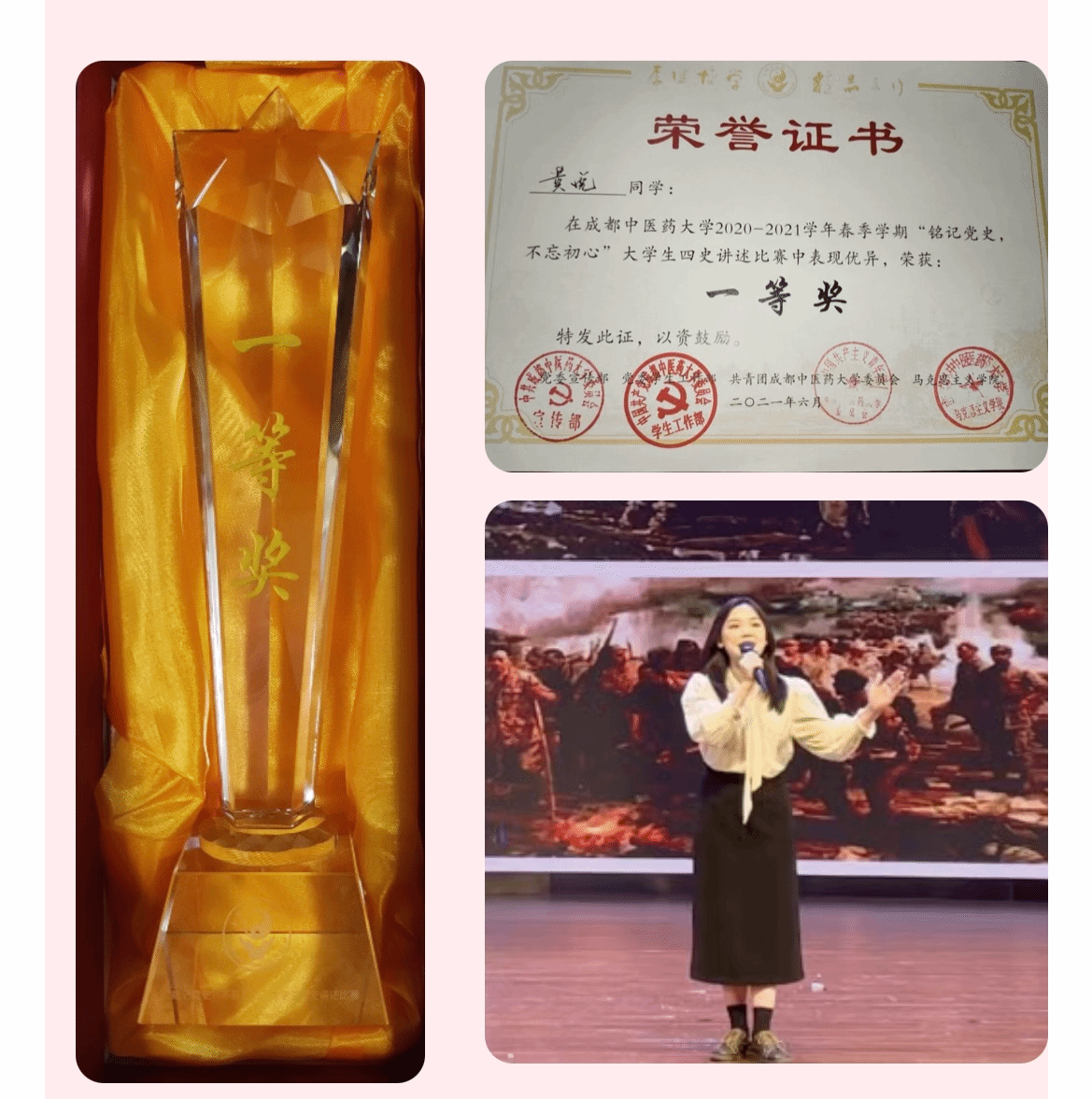 6月1日晚,成都中医药大学"铭记党史·不忘初心"大学生四史讲述比赛决赛在百会堂演播大厅成功举行!我院眼视光学2019级黄悦同学在此次比赛中荣获一等奖!