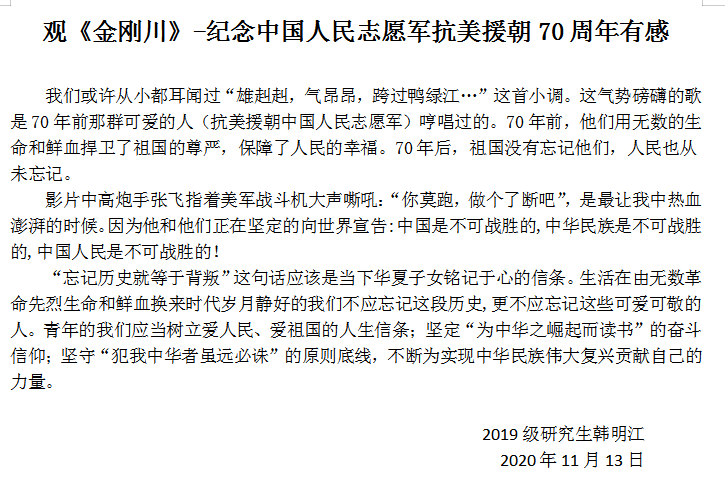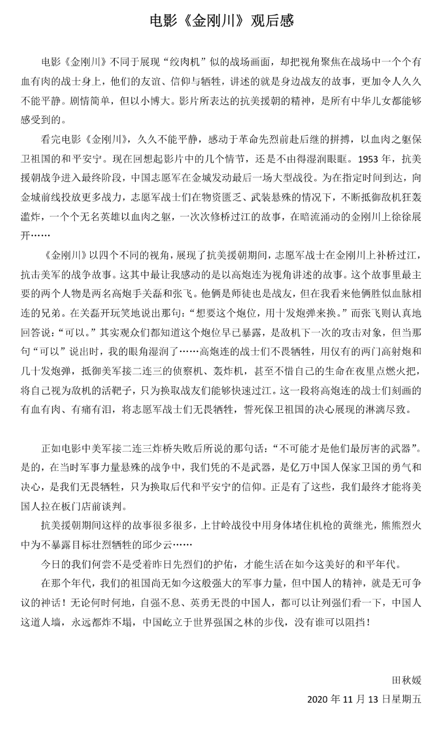 70年前,为了保卫和平,反抗侵略,中国共产党和政府毅然作出抗美援朝、保家卫国的历史性决策,英雄的中国人民志愿军高举正义旗帜舍生忘死,浴血奋战,赢得了抗美援朝战争的伟大胜利。《金刚川》中的一幕幕场景再一次震撼了所有观众,志愿军"惊天地、泣鬼神"的英雄壮举让现场观众无不为之动容。在新时代我们更需要学习中国人民志愿军的英雄事迹和革命精神,发扬斗争精神,增强斗争本领,夺取新时代中国特色社会主义伟大胜利。