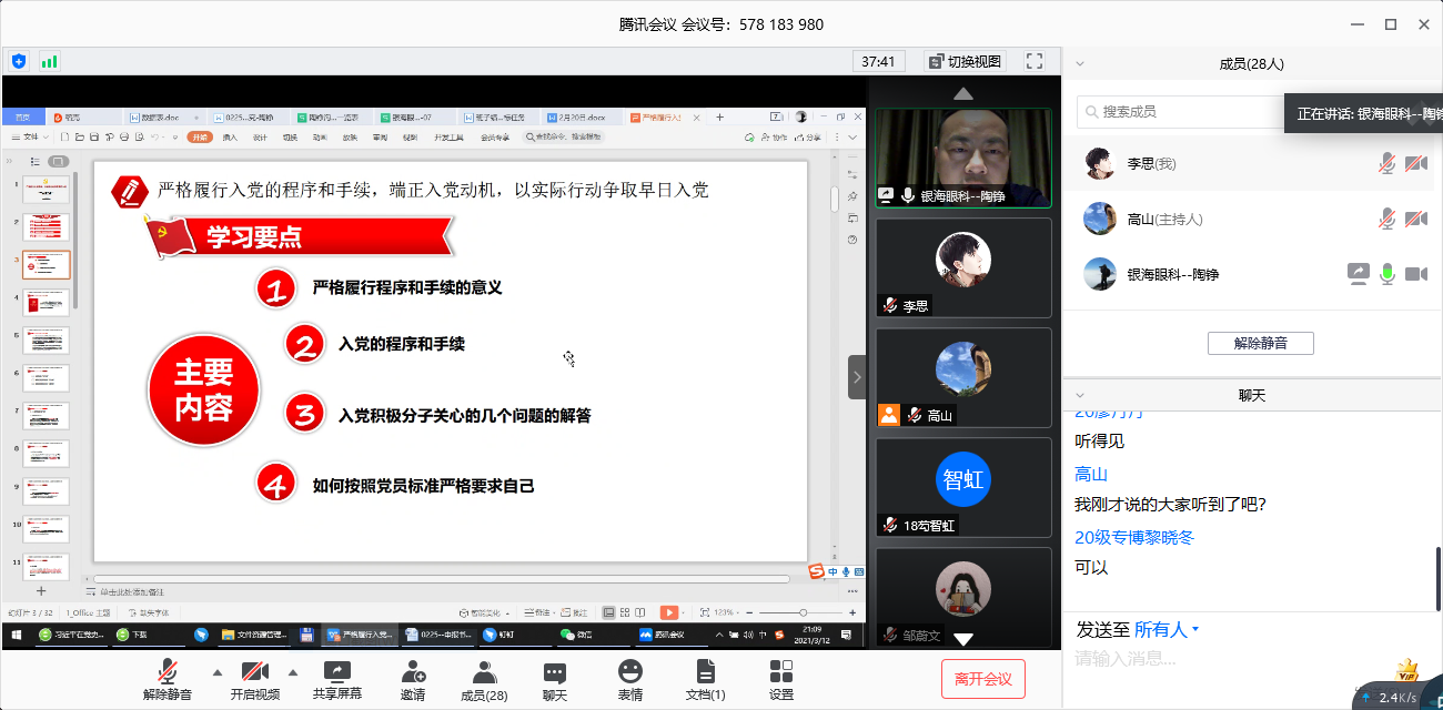 2021年3月12日晚九点,第64期入党积极分子、2021年第一期发展对象在线专题培训顺利开展。院党委副书记陶铮主讲,院党委组织员高山主持。