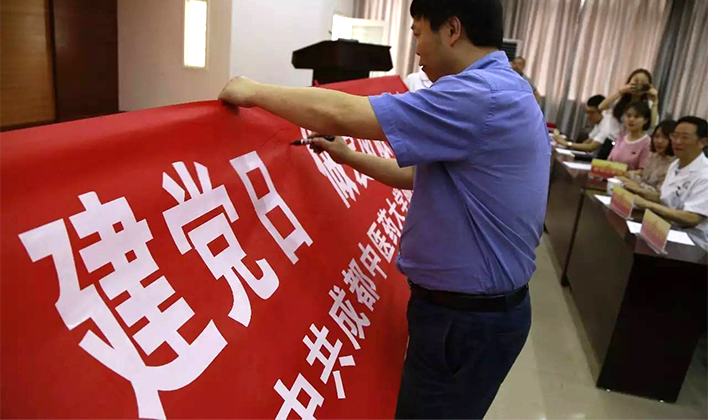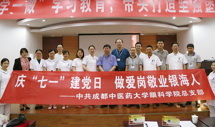 又是一个流光溢彩的七月,大江南北普天共庆!七月的大地,有一种旗帜在招展;七月的天空,有一种渴望在涌动!2017年6月30日下午,成都中医药大学附属银海眼科医院/眼科学院党总支在六楼学术报告厅举行"庆‘七一’建党日,做爱岗敬业银海人"党日活动。全院共产党员、民主党派代表、无党派人士和学生代表欢聚一堂,共同庆祝党的96岁华诞,用歌声表达对党的无比热爱和对辛勤工作在各个岗位上优秀党员的由衷赞美。会议由院党政办公室主任陶铮主持。