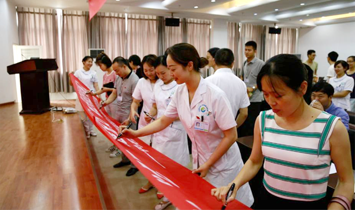 全院党员及职工在"庆‘七一’建党日,做爱岗敬业银海人"横幅上签名留念,以此响应周华祥主任的号召。