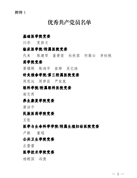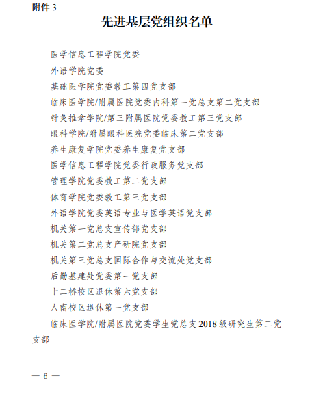 今年是中国共产党成立100周年,我院各党组织和广大党员干部深入学习贯彻习近平新时代中国特色社会主义思想,积极开展"不忘初心、牢记使命"主题教育和党史学习教育,在落实立德树人根本任务,在学校"双一流"建设和医院发展过程中做出突出成绩。根据《中共成都中医药大学委员会关于做好学校"两优一先"推荐工作的通知》(成中医组织〔2021〕24号)具体安排,经过院党委推荐、择优遴选,学校党委集中评审、严格考察,学校党委常委会审批,我院谢艾芮同志名获评学校优秀共产党员,临床第二党支部获评学校先进基层党组织。