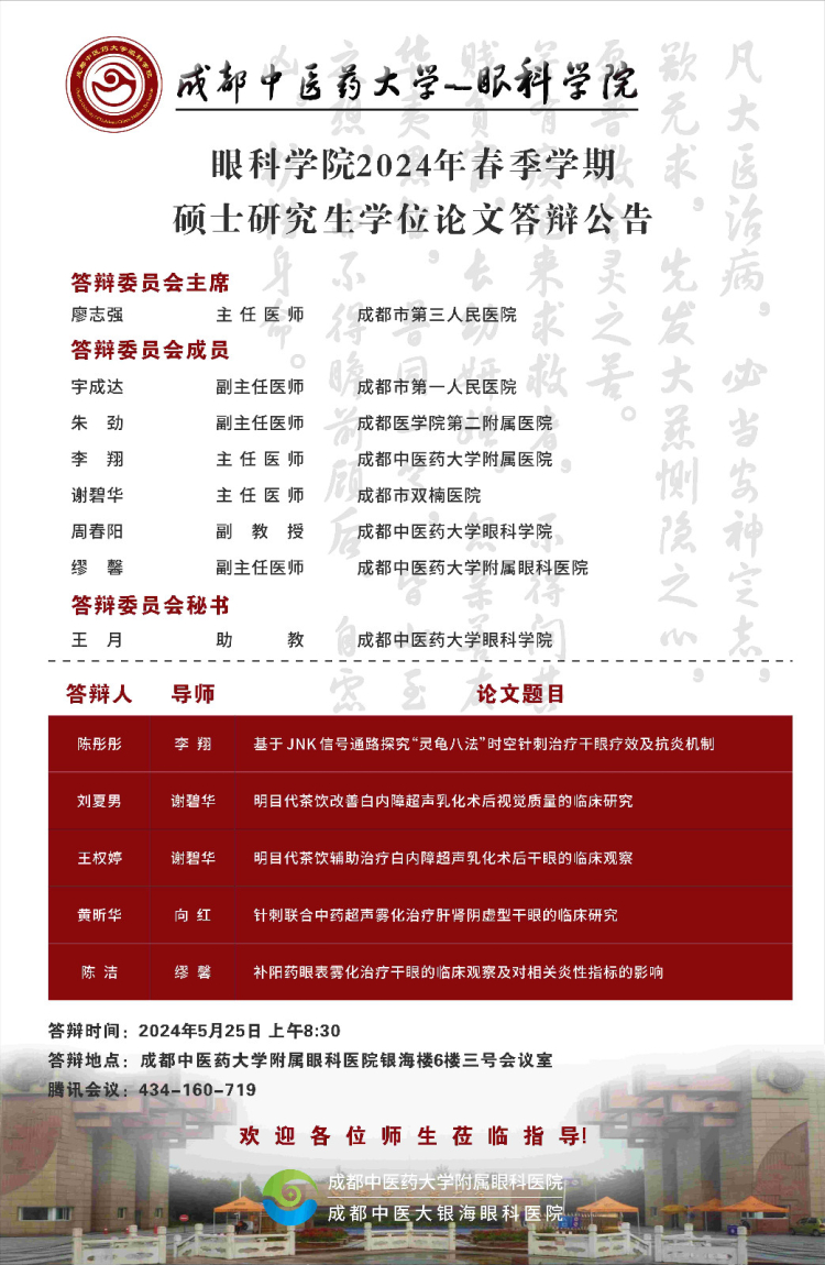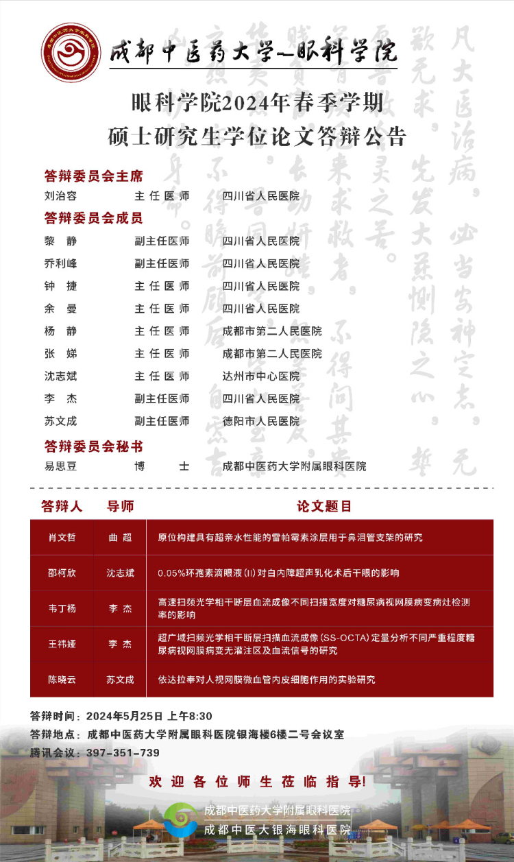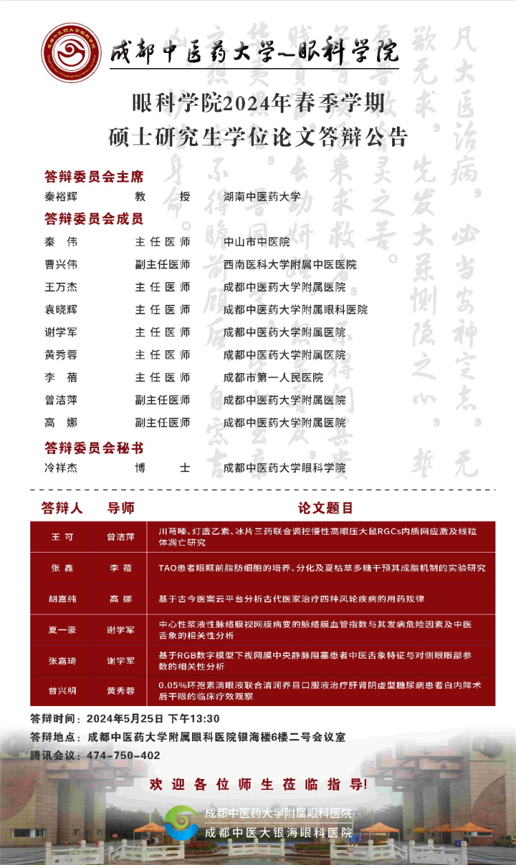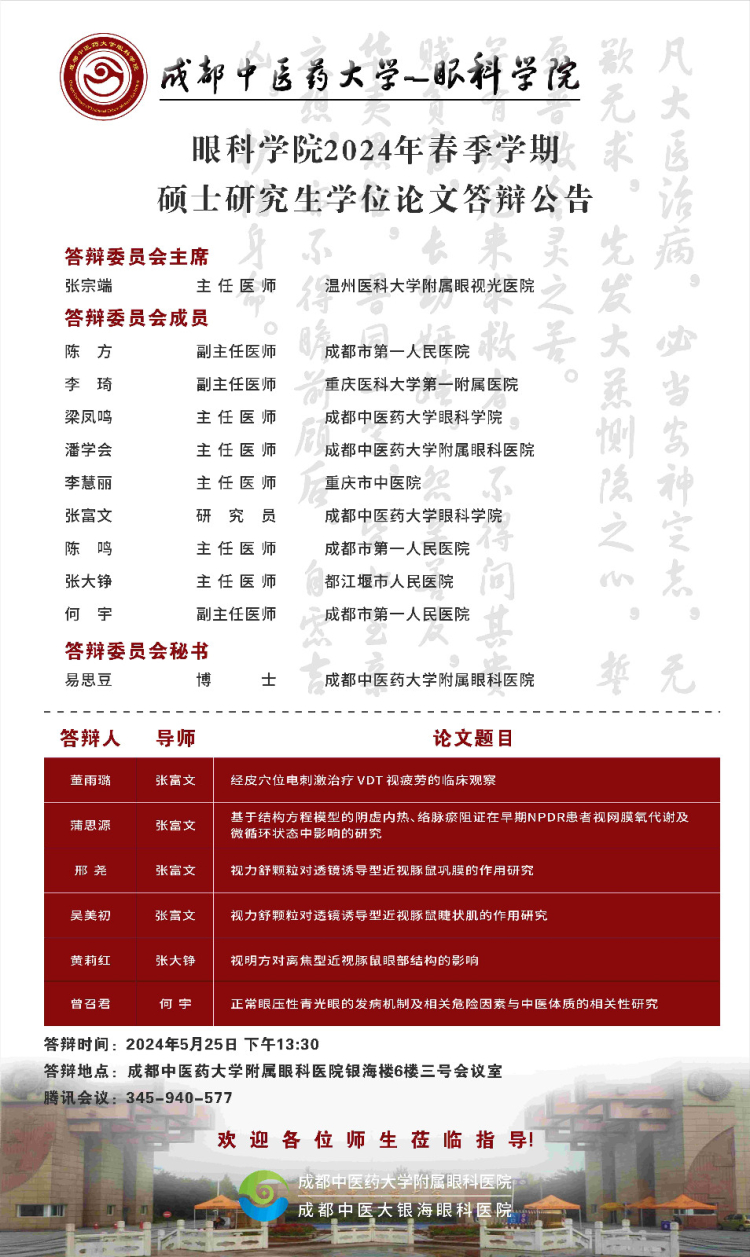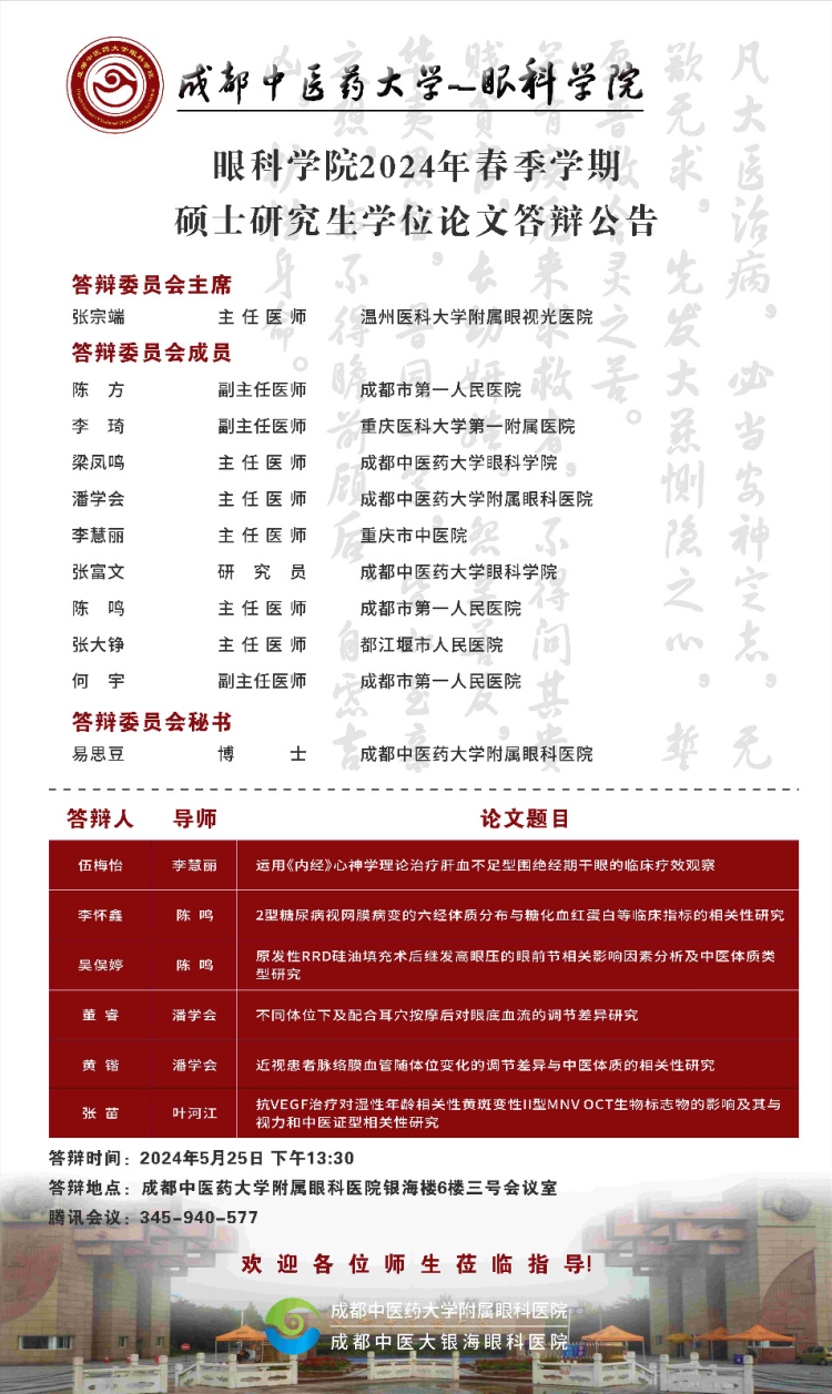 成都中医药大学眼科学院2024届硕博士研究生学位论文答辩会将于2024年5月25日举行,具体答辩信息如下图所示: