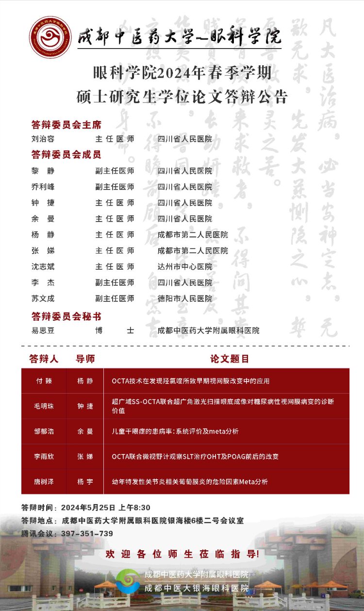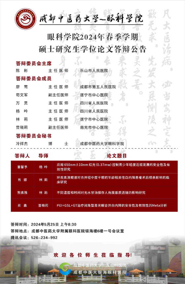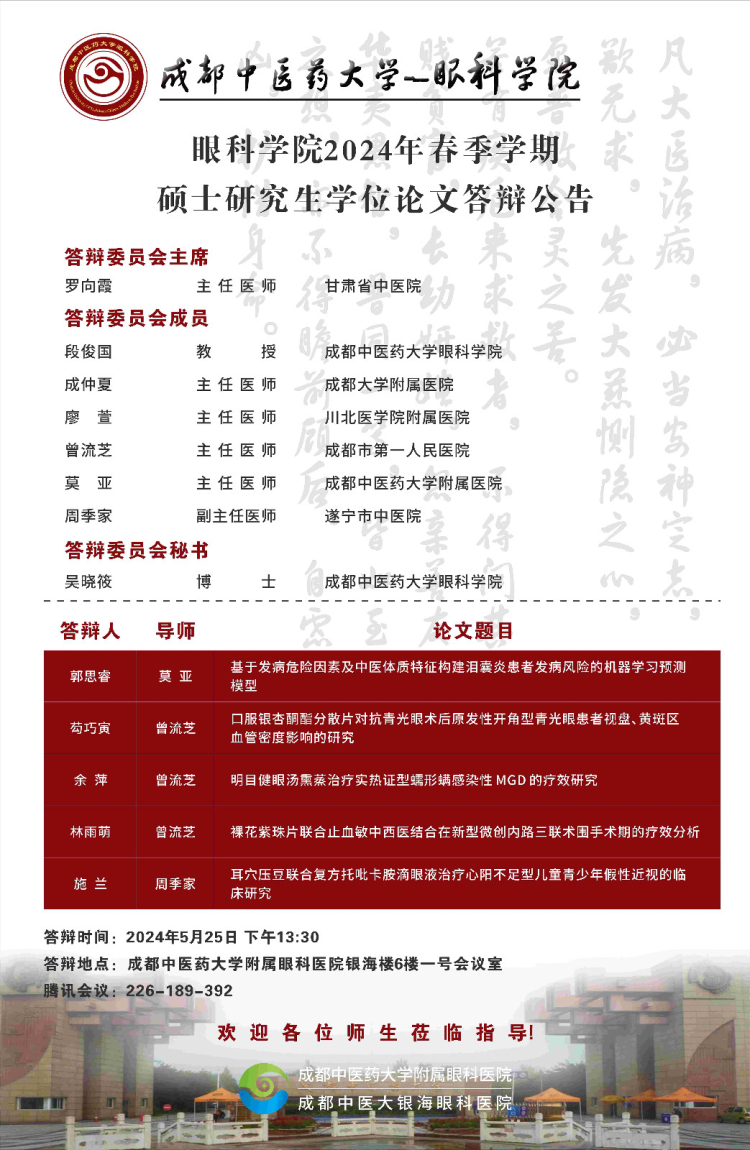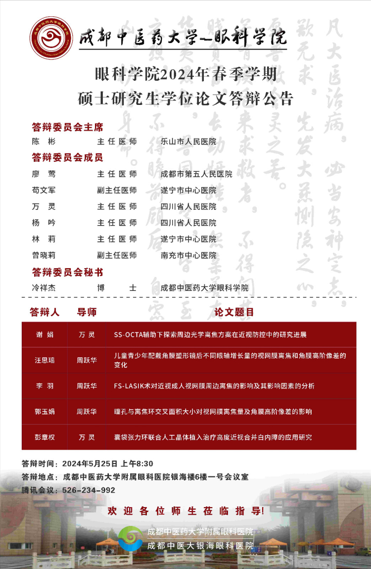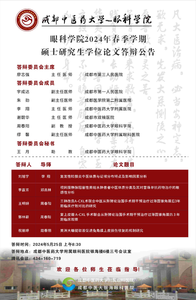 成都中医药大学眼科学院2024届硕博士研究生学位论文答辩会将于2024年5月25日举行,具体答辩信息如下图所示: