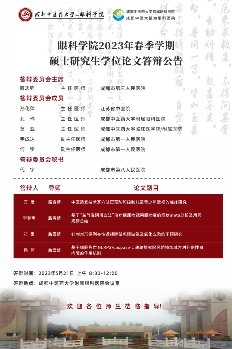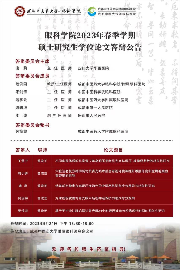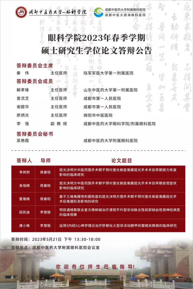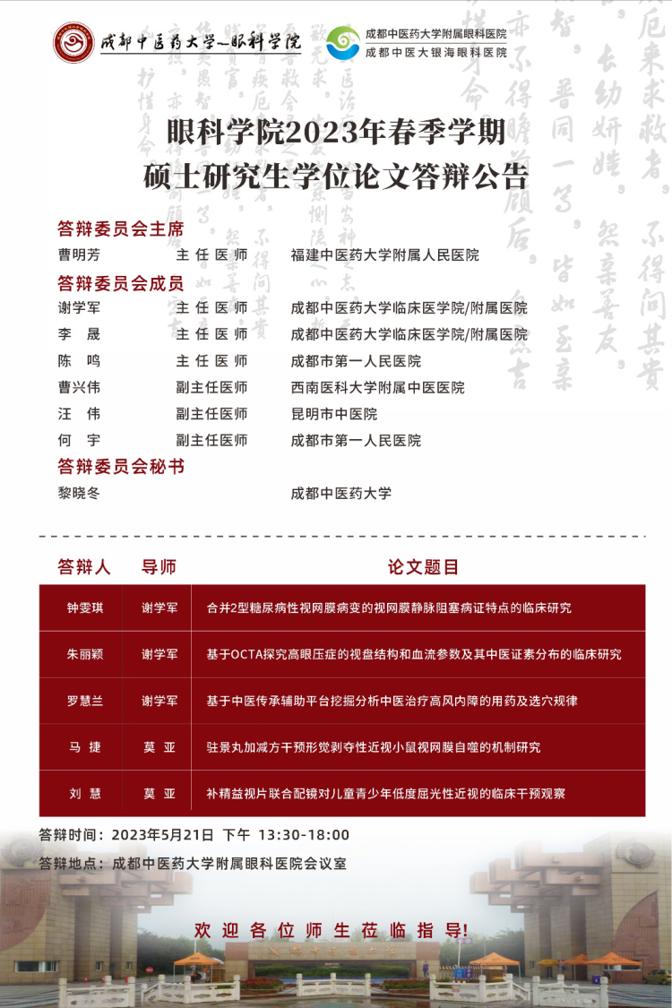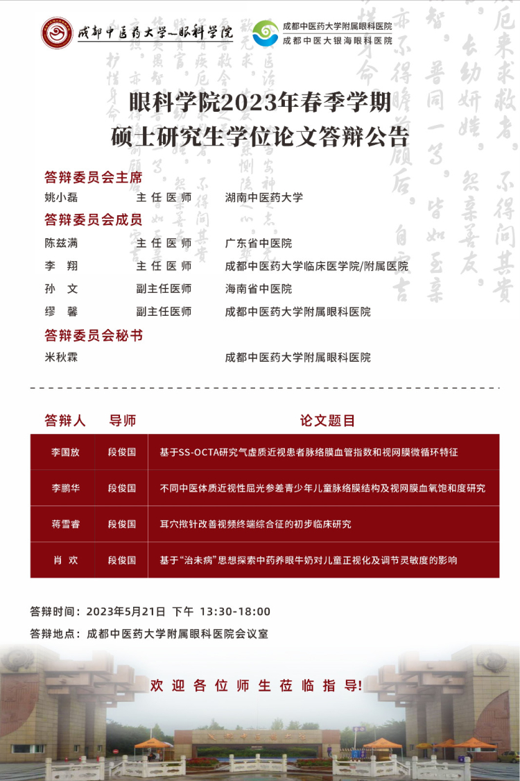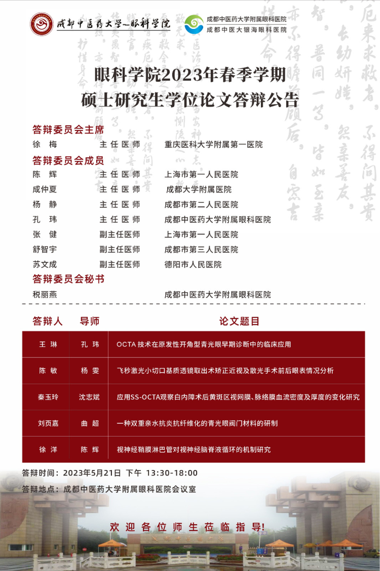 成都中医药大学眼科学院2023届硕博士研究生学位论文答辩会将于2023年5月20日-21日举行,具体答辩信息如下图所示: