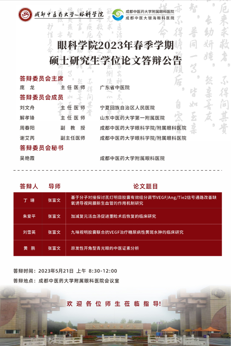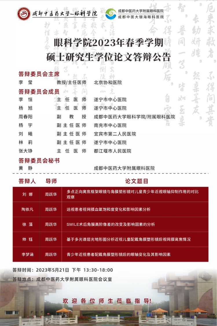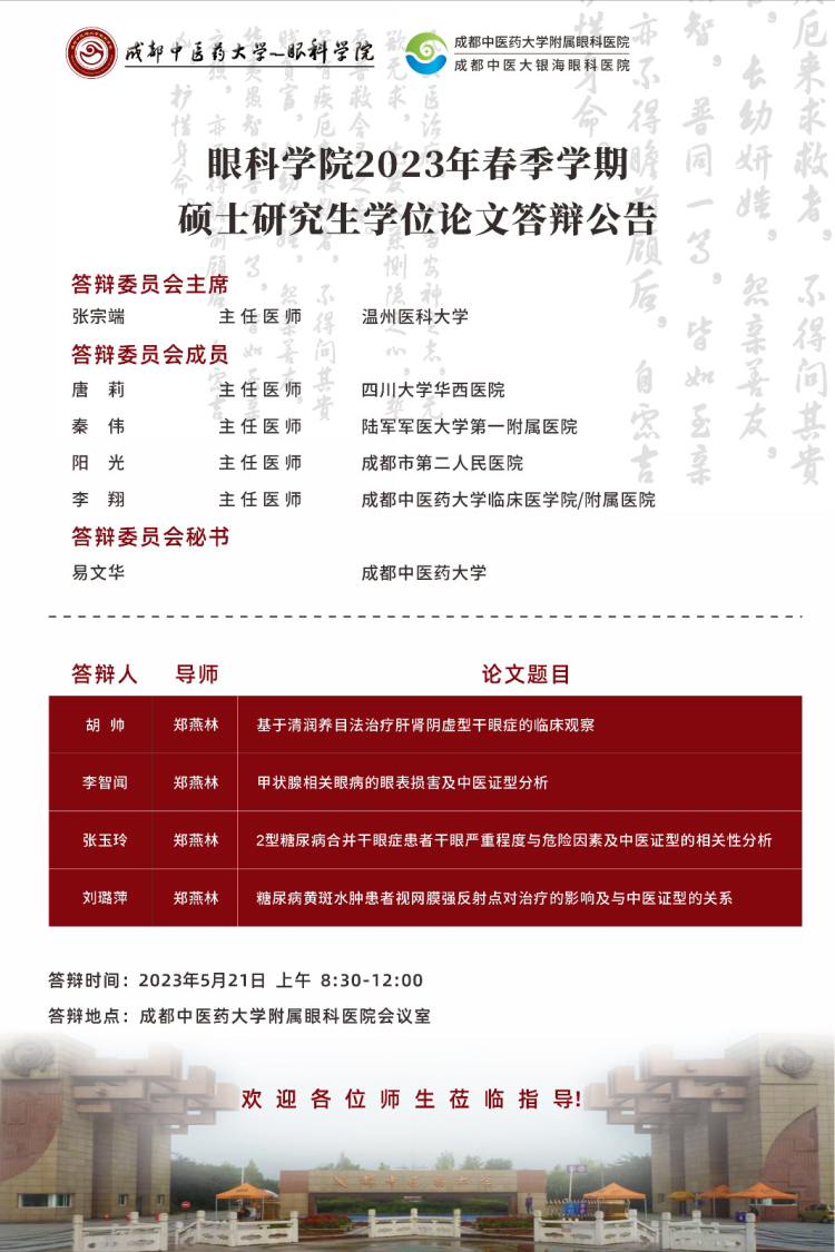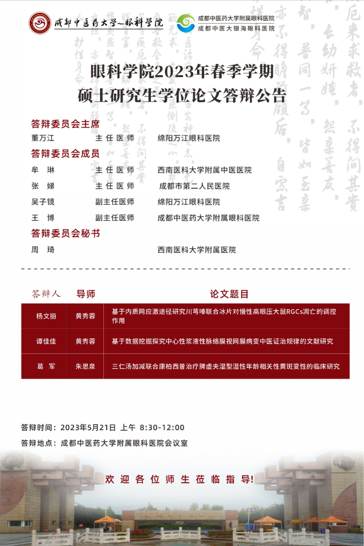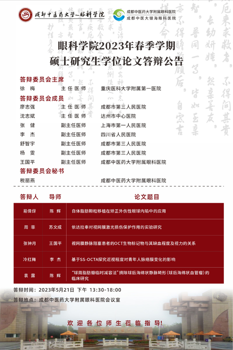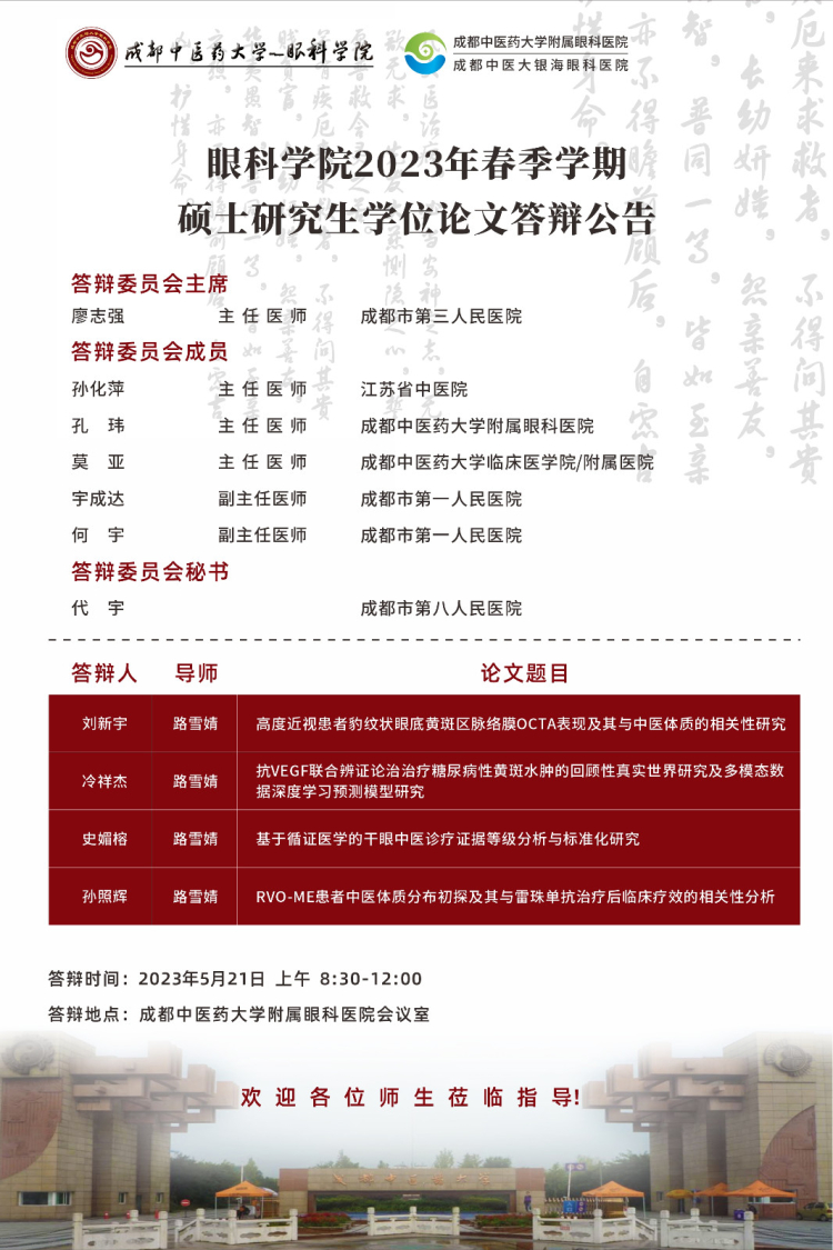 成都中医药大学眼科学院2023届硕博士研究生学位论文答辩会将于2023年5月20日-21日举行,具体答辩信息如下图所示: