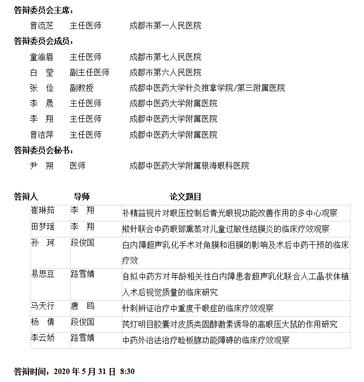 眼科学院2020年硕士研究生学位论文答辩公告(一)