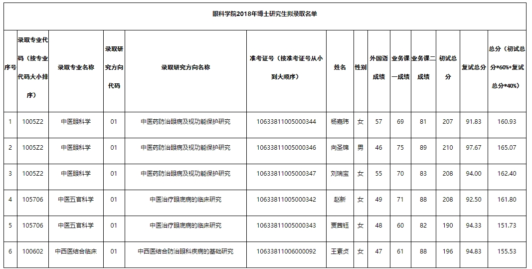 眼科学院2018年博士研究生拟录取名单